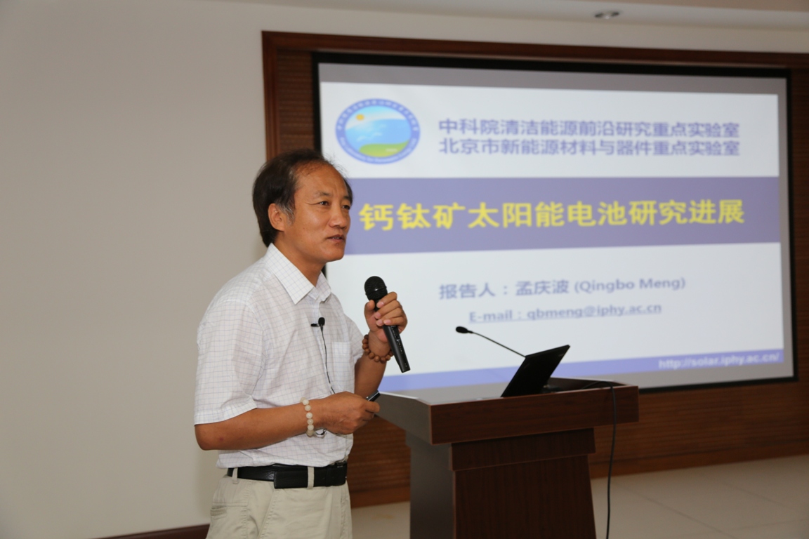孟庆波研究员首先介绍了钙钛矿太阳能电池的结构、工作原理和最新进展,重点讲述中科院物理所太阳能材料与器件团队在该领域所做的系列富有创新性工作,包括利用界面工程调控界面结构实现了无空穴传输材料(HTM)钙钛矿电池率先突破10%光电转换效率;基于碳电极无空穴传输材料(HTM)钙钛矿电池突破12%光电转换效率;首次利用原子层沉积技术在无HTM钙钛矿电池CH3NH3PbI3/Au界面引入超薄Al2O3层和有机小分子TPB电子阻挡层,构建M-I-S结构(metal-insulator-semiconductor),有效抑制光生电子的复合,提高长波段光生载流子的收集效率和电池性能;利用半导体异质结二极管模型,并结合交流阻抗谱对无空穴传输材料钙钛矿电池的异质结特性进行了研究,获得电池正向电流输运机制,并从电学角度解释钙钛矿电池中普遍存在的高开路电压特性;在新型空穴传输材料方面,电池效率最高达到13.2%等。最后,将对这种新型太阳能电池目前存在的问题和发展机遇给以中肯的评述。报告后,孟庆波研究员与重点实验室师生展开了热烈的讨论与交流。
