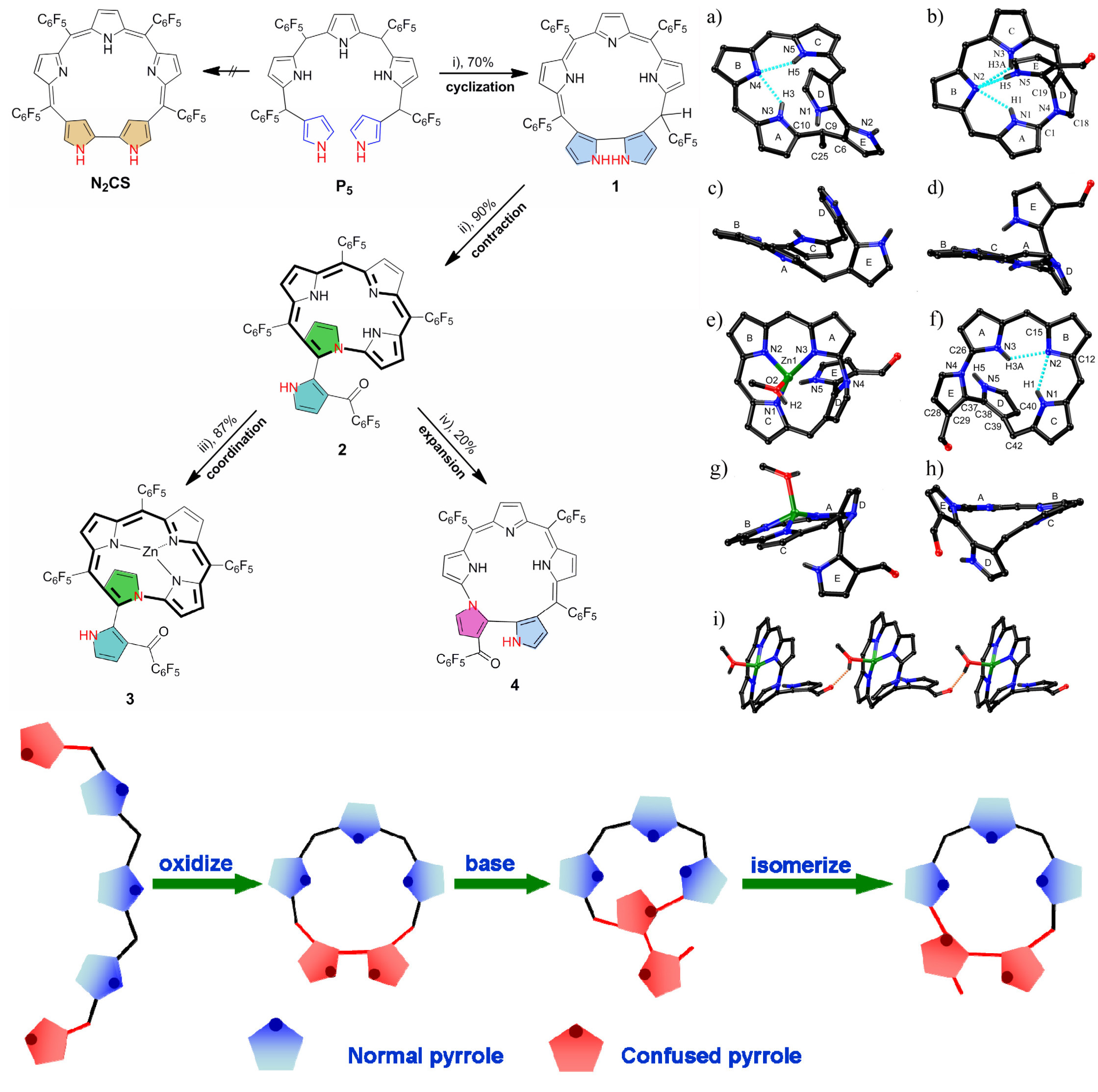 大环结构在自然界和人工功能体系中广泛存在。其中最突出的代表就是含四个吡咯单元的卟啉,它具有丰富的光电性能。近年来,发展具有特殊结构和性能的新型大环化合物,特别是卟啉类似物 异卟啉 (porphyrinoid) 的研究,引起了广泛关注。该文章将两个特殊的高活性 “混乱” 吡咯单元 (N-confused pyrrole) 配置到一个线性五吡咯分子的两端,并进行氧化环化。得到了含五个吡咯单元的新型大环结构,并在不同反应条件下对其依次进行缩环和扩环反应,得到新型四吡咯和五吡咯大环。其中,前者锌配合物荧光峰位于近红外区 736 nm 处,可望发展成一类新型荧光增强型锌离子探针。上述四个大环化合物均用单晶结构进行了表征。