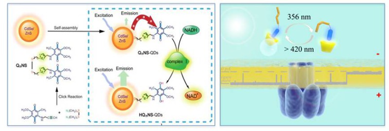 龙亿涛教授课题组长期专注于构建仿生微界面体系,此次成果是采用前期构建的有辅酶Q电子传递体嵌入的仿生膜体系,在模拟生物膜内电子传递过程的研究基础上(Nature Protocols 2013, 8, 439-450.),将仿生膜界面拓展到量子点仿生界面。利用辅酶Q功能化量子点构建的纳米仿生界面实现了复合体I(NADH:辅酶Q氧化还原酶复合体)催化从NADH到辅酶Q的质子偶联电子传递过程,人工模拟了线粒体呼吸链初始阶段。该荧光探针利用辅酶Q氧化态/还原态与量子点之间的电子传递机制不同导致荧光开关效应,实现了对复合体I的高灵敏检测,并成功应用于人神经瘤SH-SY5Y细胞内复合体I缺失水平的监测,从而获得了与神经退行性疾病相关的重要信息,并有望在帕金森症的早期预警与诊断等方面获得实际应用。