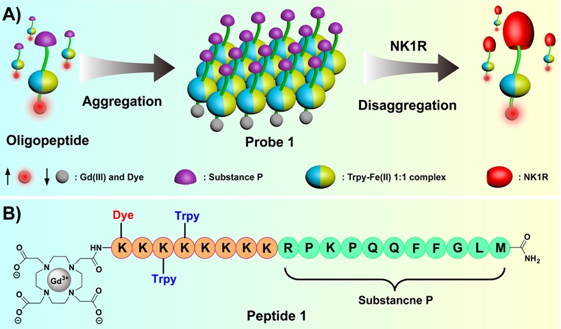 基于前期多肽分子探针在生物大分子识别与传感方面应用(J. Am. Chem. Soc. 2011, 133, 9720;J. Am. Chem. Soc. 2012, 134, 1958)及分子探针在肿瘤早期诊断与治疗方面应用的基础上(Theranostics, 2013, 6, 395,front cover;Chem. Commun. 2014, 50, 6120; Chem. Commun. 2014, 50, 6443, inside cover; Sci. Rep. 2014,4, 6860;Nanoscale, 2014, DOI: 10.1039/C4NR04405C), 研究人员对以肺癌血清过表达的速激肽-1受体(NK1R)为特异性靶向受体,首次设计了一种基于解聚集的磁-光双功能新型探针用于肺癌的检测。当探针和NK1R结合后,探针解聚集从二维结构变为一维结构,这一过程能够显著增强分子探针的荧光和磁信号。因此,这一关-开响应能够检测肺癌病人的血清过表达的NK1R从而能够有效地将肿瘤患者从正常的人群中区分出来,而且该平台也为设计受体分子探针的研究提供了新的通道,特别能被应用到其它相关领域的研究。