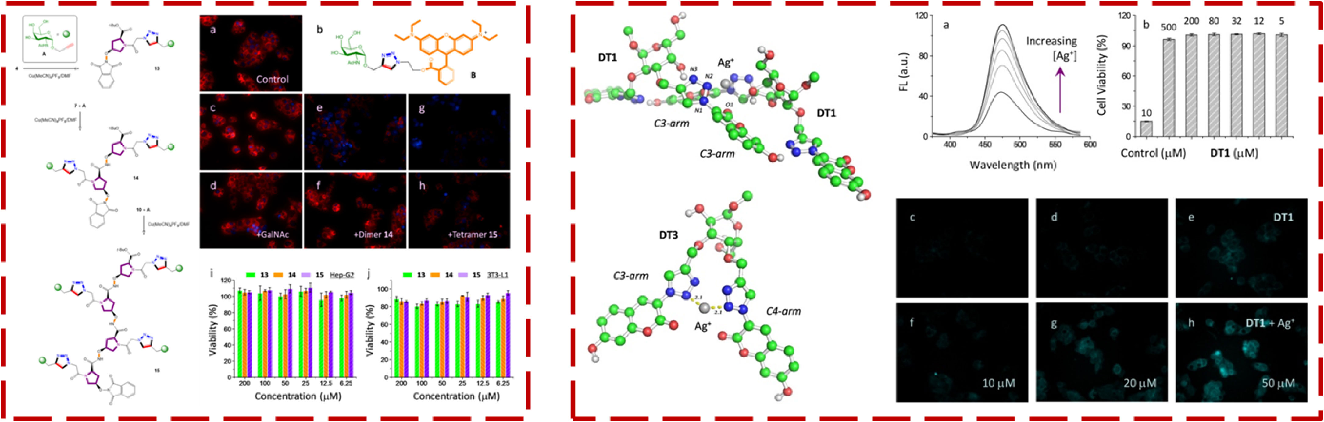 此外,研究人员创新发现在一个天然糖骨架的不同修饰位点进行“点击化学”修饰可实现对于银离子的荧光“开关/关开”式调控,并应用“关开”探针实现了癌细胞内化银离子的荧光标记(Sci. Rep. 2014, 4, 4252,下图右);进一步利用糖的细胞靶向性,首次在多种不同组织来源的癌细胞中选择性实现了对肝癌细胞内化汞离子的荧光标记(Chem. Commun. 2014, 50, 11735),为后续发展可识别肿瘤异常相关分子的荧光分子探针提供了研究基础。