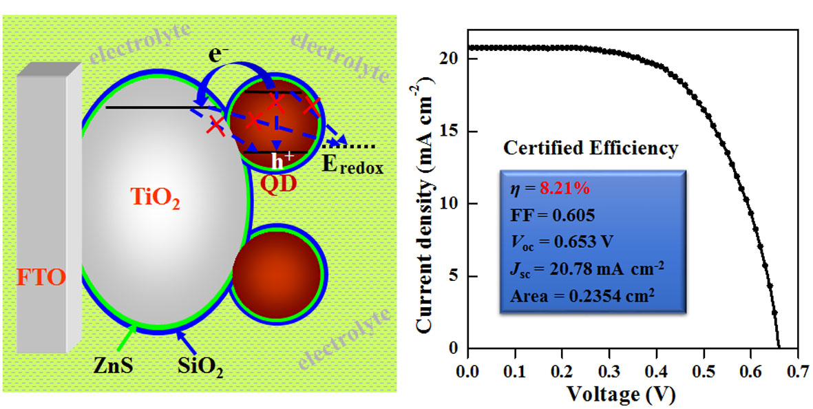 高效率、低成本太阳电池是解决化石能源枯竭、气候变暖等社会问题的有效途径。量子点敏化太阳电池(QDSC)采用具有独特优异光电性能的半导体纳米晶(又称量子点,QD)作为敏化吸光材料,被认为是最有潜力的低成本第三代太阳电池, 具有重要的商业开发潜力和理论研究价值。遗憾的是受制于严重的电荷复合,先前QDSCs转换效率记录处在6-7%的水平。因此抑制电荷复合成为提高电池效率的必由之路。通过密度泛函理论计算,结果发现随着分别沉积ZnS,及ZnS/SiO2后,电子态密度在TiO2板层结构的最外原子层占比分别降低1-2个数量级。电子态密度的降低对应着发生在光阳极TiO2界面电荷复合的抑制。亚皮秒分辨太赫兹谱证实了上述理论计算预测的结果,同时阻抗谱测试也清楚表明ZnS、SiO2宽能带材料的包覆可以大幅提高复合阻抗值及电子扩散距离从而有效抑制复合。光电测试结果表明在量子点敏化的TiO2光阳极膜上顺序沉积ZnS, SiO2后可以将CdSeTe QDSC的开路电压显著提高,相应地电池平均效率从2.53%提高到8.37%,官方认证效率为8.21%。