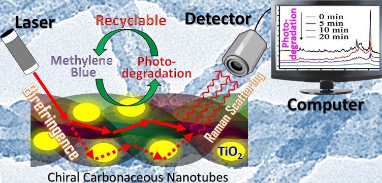 无机手性半导体材料由于具有可控的微观形貌、大的比表面积、优异的导电性及特殊的光学性质,而被广泛用于催化、生物探针、光学器件等研究领域。而手性碳纳米管由于具有大的比表面积,在表面增强拉曼散射(Surface enhanced Raman scattering, SERS)领域具有大的应用前景。目前已报道的半导体基SERS基底大都是由具有粗糙表面的贵金属颗粒引发的等离子共振或化学SERS增强效应,虽然贵金属引起的SRES增强因子较高,但其成本也相对较高、化学稳定性较差难以实现探针的回收。因此,本文通过在手性碳纳米管内外负载高分散的TiO2纳米单晶,首次利用TiO2的光催化与手性碳纳米管的双折射之间的协同效应,实现了可光催化回收SERS探针的设计与制备。所设计制备的手性CNT/TiO2复合材料对亚甲基蓝、甲基蓝等多种有机污染物都具有较好的拉曼增强效果,在没有贵金属的情况下其增强因子可以达到3 × 103。此外,该手性复合材料具有较高的光催化活性,可以实现太阳光驱动下被检测污染物的快速降解,使SERS基底具有良好的再生能力。这种基于手性双折射的原理提高SERS检测灵敏度的方法以及结合光催化实现探针再生的技术将有望显著推动非等离子共振SERS基底的开发与应用。