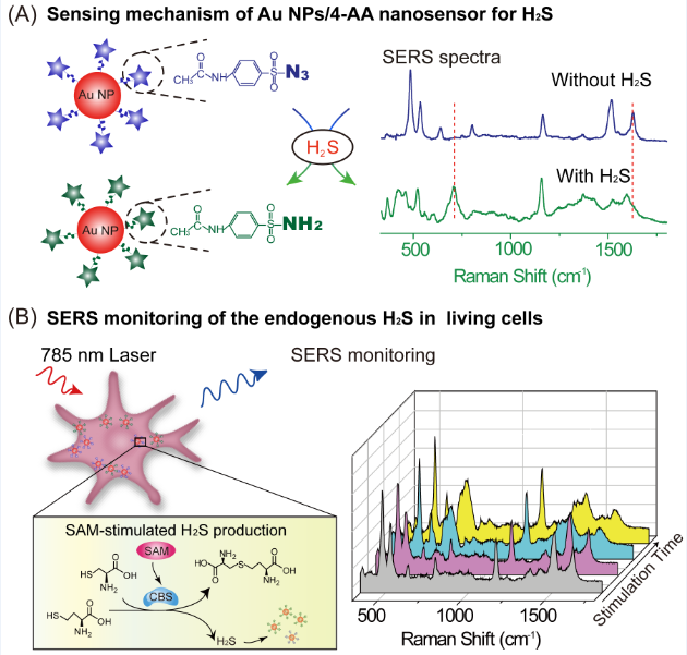 图片说明:表面增强拉曼光谱监测活细胞中内源性H2S示意图