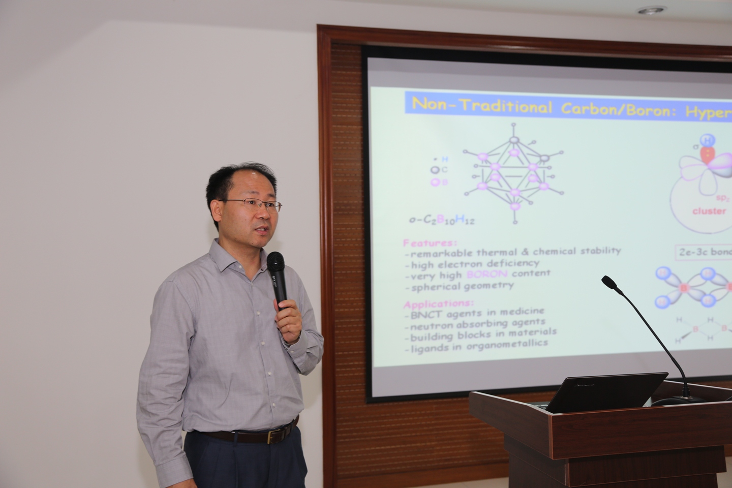 碳硼烷衍生物由于其独特的分子结构、热稳定性和反应性而具有广阔的应用前景。谢作伟教授首先阐述了碳硼烷笼的的结构特征,并着重介绍了碳硼烷化学中最受关注的具有二十面体构型的二碳代-闭式十二硼烷(C2B10H12),其中又分为邻碳硼烷(o-C2B10H12)、间碳硼烷(m-C2B10H12)和对碳硼烷(p-C2B10H12)。通过过渡金属催化对碳硼烷笼上的碳上或硼上进行功能化修饰,提出了碳硼烷的不同种类的反应。例如,碳硼烷与炔烃的反应,可以生成六并环或者五并环的产物,通过条件的控制,可以得到单一构型的一种类型的主要产物;并通过转金属化,捕捉到稳定的中间体,详细研究了其反应机理。同时,提出碳硼烷在功能材料、医学等领域的潜在应用前景。报告后,田禾院士以及老师和同学们针对报告内容与谢作伟教授进行了深入的探讨与交流。