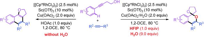 近年来,直接过渡金属催化炔醇的串联反应已经广泛的应用于含有杂原子的多环化合物骨架天然产物和药物的合成中。然而,这些反应大多数是经过炔醇的环异构化和其他各种类型反应如Prins环化、Diels-Alder反应和Povarov反应等的串联。该工作旨在通过合并两种不同催化活性催化剂的方法,探索出了能兼容路易斯酸和过渡金属铑络合物的共催化体系,选择性地实现了炔醇和内炔的交叉C–H键活化/环化串联反应。在无水的反应条件下,炔醇和内炔经过环异构化和C–H键活化的串联反应,高选择性地得到了萘并二氢呋喃。当在含有水的反应条件下,炔醇的水合产物经过分子内的醇羟基和酮羰基的加成反应,形成半缩酮中间体,随后再和内炔发生铑络合物催化的羟基导向的C–H键活化反应,以比较好的收率、高选择性地得到了螺环缩酮。机理的研究发现,水和适合的酸性反应环境在调控两种不同反应路径上起着关键的作用。