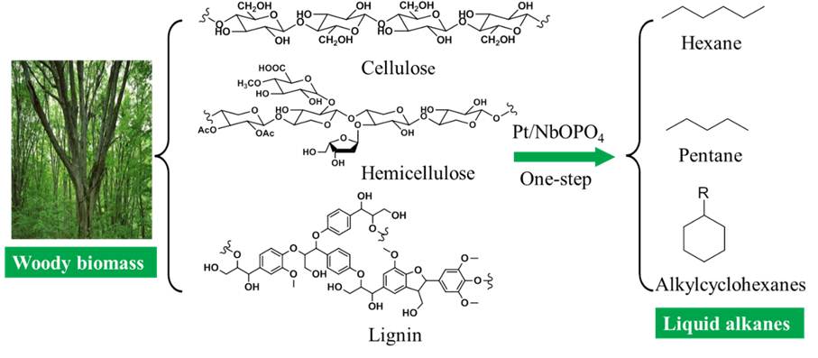 从可再生的生物质生产可持续的燃料对于我们摆脱对化石燃料的依赖越来越重要。植物秸秆及农林废弃物等木质生物质主要由纤维素、半纤维素和木质素三部分组成,由于其成分复杂、结构稳定,因此在催化转化过程中通常需要对其进行预处理和分离,然后再针对各组分分别转化,周期长、能量效率低。该成果创新性地构建了多功能的Pt/NbOPO4催化剂,使得木质生物质在不经过化学预处理或分离的情况下在温和的条件下直接完全脱氧加氢,得到液态烷烃(纤维素、半纤维素和木质素组分分别转化为己烷、戊烷和烷基环己烷),质量收率高达28.1 wt%,这是首次通过催化转化的方式实现原生生物质到液态烷烃的直接转化。在该多功能Pt/NbOPO4催化剂中,NbOx物种起到了决定性的作用,其既作为酸中心发挥水解、脱水的作用,同时又具有活化C-O键的能力,促进脱氧加氢过程的进行,这进一步得到了DFT理论计算和原位非弹性中子散射实验的证实。该成果为利用木质生物质资源制备可再生燃料提供了新途径,可以节约大量能耗;同时对于生物质催化脱氧加氢制备生物汽油、生物航煤和生物柴油也具有非常重要的意义。