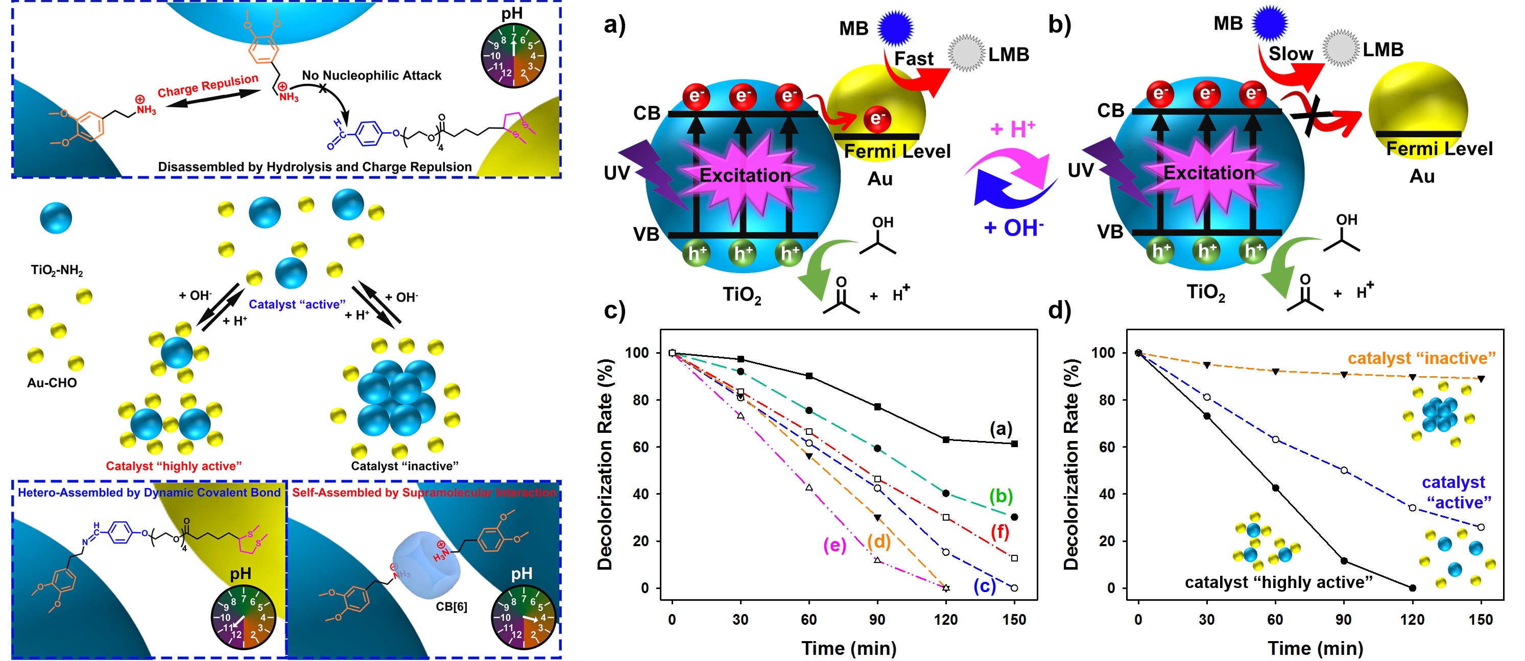 受生命体中刺激响应性酶催化的启发,近年来如何利用超分子化学作用力动态可控的优势构建人工有机、无机可转换催化剂受到了广泛的关注。在课题组的前期工作中(Angew. Chem., Int. Ed. 2015, 54, 15789;报道链接:http://hyxy.ecust.edu.cn/2015/1109/c6623a47562/page.htm),研究人员已经发现了一种通过超分子主客体作用来控制二氧化钛纳米粒子自组装,从而实现双稳态二氧化钛光催化剂的策略。在此工作中,研究人员进一步引入了醛基修饰的金纳米粒子,将其与氨基修饰的二氧化钛纳米粒子在水溶液中混合,通过在单个体系中同时引入酸碱响应的希夫碱动态共价键以及葫芦[6]脲-铵盐主客体结构,能够实现不同pH条件下两种纳米粒子的选择性自组装过程。同时,这三种处于稳态的纳米粒子体系具有完全不同的光催化活性,其催化活性分别被动态共价键控制的金-二氧化钛肖特基能垒以及主客体非共价键控制的活性催化表面共同控制,进而能够实现体系的光催化活性在“高活性”、“正常活性”以及“非活性”三个稳态的pH控制的可逆转换。这个工作首次实现了三稳态人工可转换纳米粒子催化剂,为构建多稳态人工可转换催化剂提供了新的策略,同时其独特的pH响应性、二氧化钛的光动力学治疗、金纳米粒子的光热效应等特性为这个体系在很多智能材料领域,比如癌细胞的识别与治疗等方面的潜在应用提供了保障。