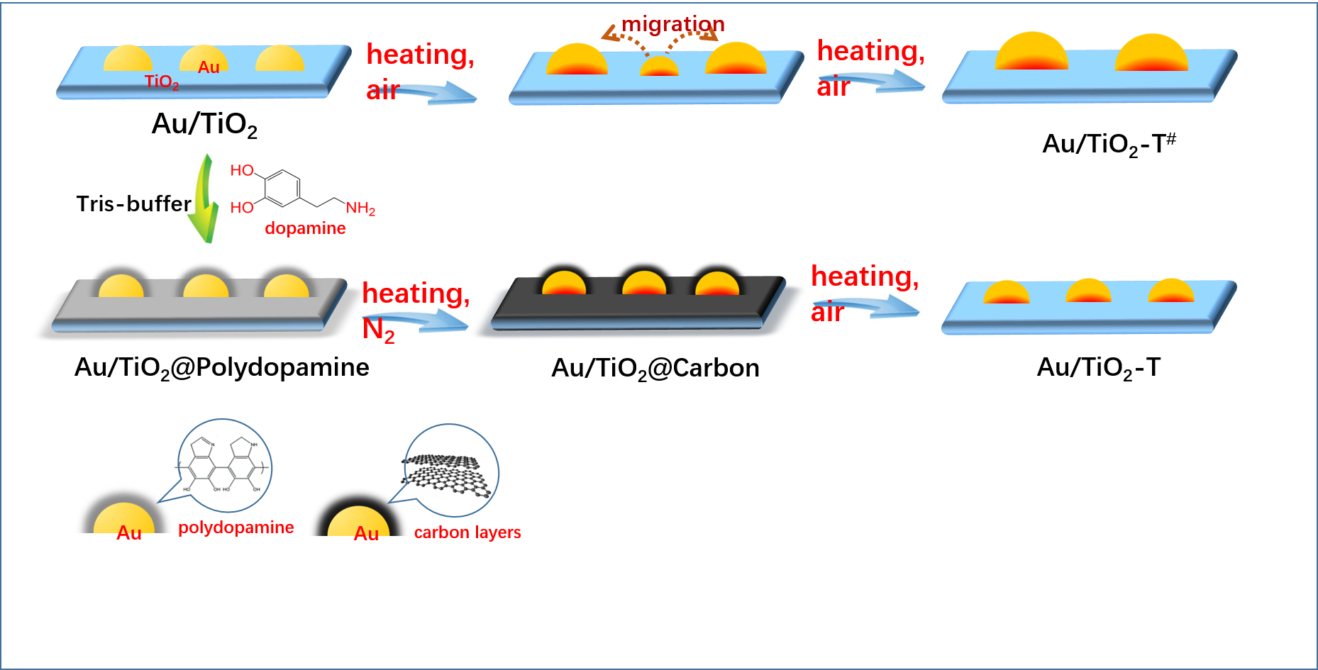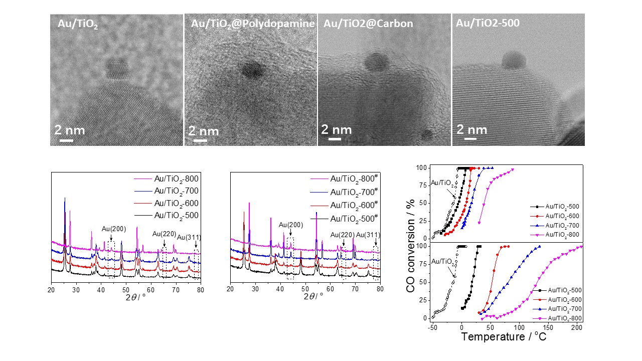 研究者创新性地开发了一种合成条件非常温和的稳定贵金属纳米颗粒的控制方法,而且该方法不受载体和贵金属种类的限制,具有很广泛的适用性。对于某一特定的负载型贵金属纳米催化剂,首先将负载型贵金属纳米催化剂置于多巴胺室温聚合的反应体系中,在贵金属纳米颗粒和载体表面形成有机聚合物,然后在氮气气氛中焙烧将有机聚合物转变成炭层,该步骤有别于传统制备方法中采用的空气焙烧,在炭化过程中可有效增加贵金属颗粒与载体之间的相互作用(接触性增强以及产生电子转移),从而使得在后续高温空气焙烧过程中,贵金属纳米颗粒的烧结得到极大地抑制。同时,包覆在TiO2载体表面的炭层可有效提高载体的热稳定性,从而进一步抑制了载体和贵金属颗粒之间的界面重构。最终,导致贵金属催化剂在高温热焙烧后仍能保持较高的CO氧化和丙烯催化燃烧反应活性,而没有经过炭化热处理的催化剂在两个反应中的活性急剧下降。