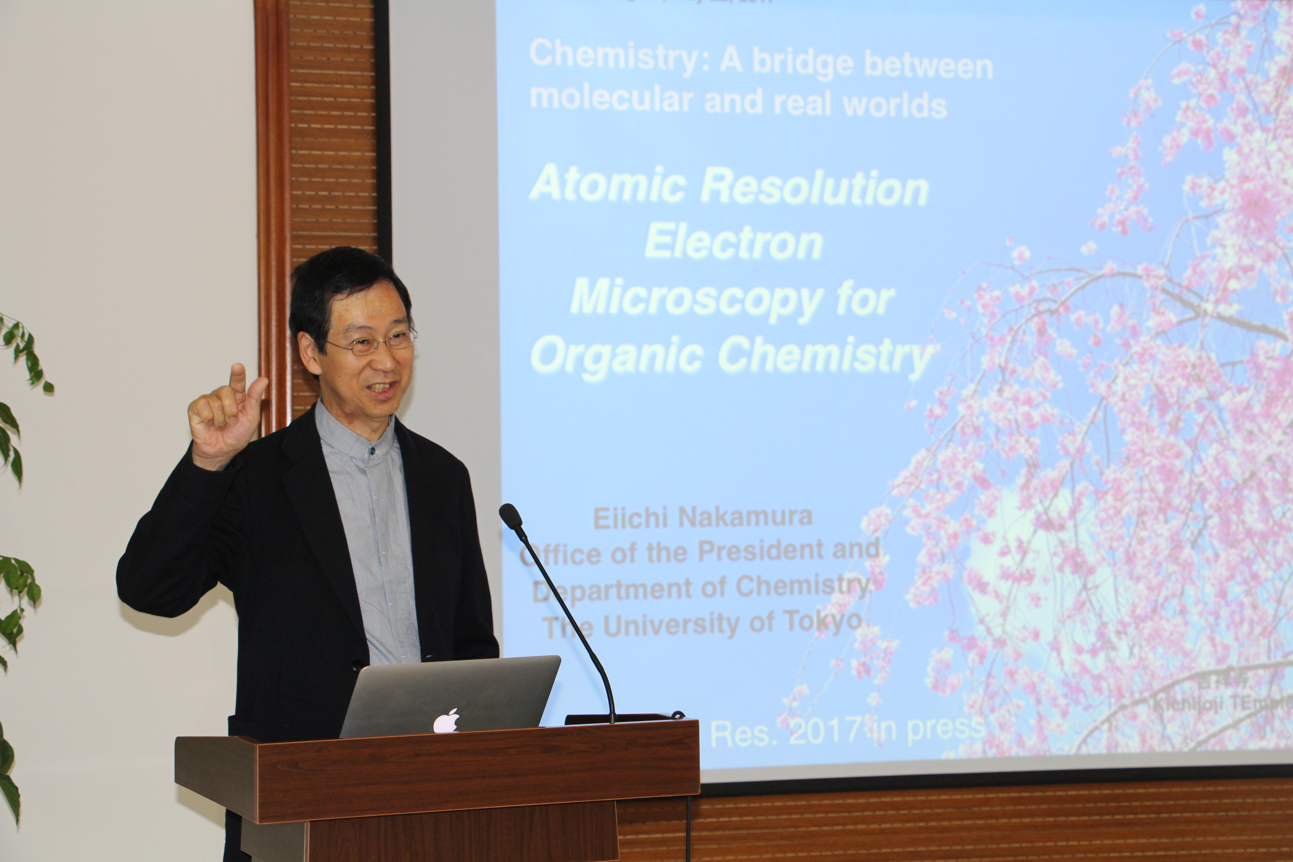 5月23日,应化学与分子工程学院田禾院士的邀请,《美国化学会志》副主编、东京大学Eiichi Nakamura教授来到365英国上市集团官网进行学术交流,并为广大师生作了题为《化学:连接分子和真实世界的桥梁——原子级分辨率电子电镜在化学中的应用》(Chemistry: A bridge between molecular and real worlds – Atomic resolution electron microscopy for chemistry)的讲座报告,报告由化学与分子工程学院院长朱为宏教授主持,田禾院士、龙亿涛教授、解永树教授、马骧教授等参加了学术报告会。