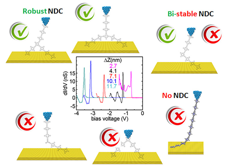 负微分电导(Negative Differential Conductance,NDC)效应是电流随着偏压增加而减少的一种现象,因其独特的性质在分子开关、分子放大器、分子存储器等方面得到了广泛的应用。在本研究工作中,首先通过超高真空环境下的表面Ullmann反应在超洁净的Au(111)表面合成了T型、L型和直线型的聚卟啉分子。然后,通过扫描隧道显微镜的针尖操纵,将不同形状的聚卟啉单分子链从Au(111)表面上拉起,可以选择性地控制电荷在不同形状的聚卟啉单分子链中的传输路径。在此基础上对单分子链的构型、构象以及电荷传输路径对负微分电导效应的影响进行了系统研究。发现对于T型聚卟啉分子,电荷通过T形单分子结时会产生稳定和显著的NDC效应;对于L型的啉分子,电荷通过90°拐点时会产生双稳态NDC效应,但是通过120°拐点时则不会产生NDC效应;而对于直线型聚卟啉分子,电荷通过时不会产生NDC效应。通过第一性非平衡格林函数计算,对金属——分子——金属单分子结的电荷传输进行了模拟,揭示出NDC效应的内在机制:(1)基于分子骨架的分子轨道决定了共振电荷传输的通道;(2)分子轨道与电极之间的耦合强度受到外加偏压的调控,偏压越高,耦合强度越弱。这种NDC效应产生机制的新发现可以为各种具有NDC效应的分子结的构建提供指导和理论根据,为NDC分子器件的设计开辟了新的路径。