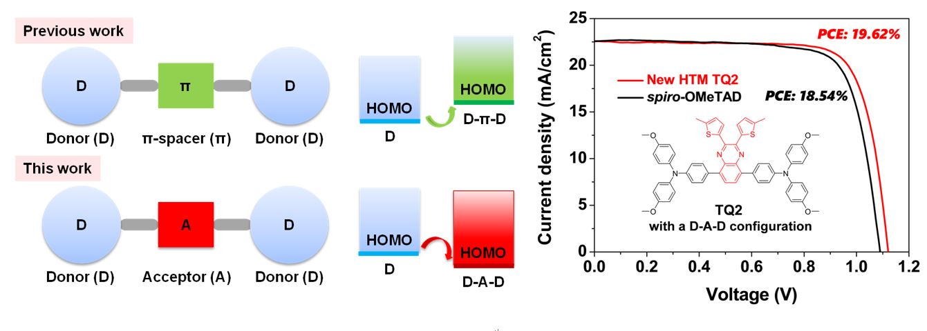 钙钛矿太阳能电池的空穴传输层能够促进光生电荷的提取和收集,并保护吸光层。目前,钙钛矿太阳能电池器件中常用的HTM2,2',7,7'-[N,N-(4-甲氧基苯基)氨基]-9,9'-螺二芴(spiro-OMeTAD),其昂贵的成本是制约钙钛矿太阳能电池实际应用的瓶颈之一。部分研究工作表明,将复杂的螺芴核替换成简单的π桥连,构建给体桥连-给体(D-π-D)HTM,可以简化合成路线,降低成本。然而,π桥连的富电子性会抬高分子HOMO能级,降低其本征稳定性。研究人员通过引入弱吸电子的喹喔啉单元,构建给体-受体-给体(D-A-D)HTM,合理调控HTMHOMO能级,优化钙钛矿太阳能电池器件界面能带排布。与spiro-OMeTAD相比,这种D-A-D型的HTM分子具有更好的光稳定性,热分解温度提升了30 oC,合成成本降低了30倍。以噻吩取代的HTM分子TQ2制备的钙钛矿太阳能电池器件取得了19.62%的光电转换效率,优于参比化合物spiro-OMeTAD(18.54%)以及苯环取代的HTM分子TQ1(14.27%)。荧光寿命表征以及导电率测试表明噻吩取代的HTM分子有更好的空穴提取和传输能力。进一步通过单晶分析发现TQ2分子间存在S---S以及S---π相互作用,缩短了分子间三苯胺单元的距离,增加了空穴传输通道。该工作为设计低成本、高性能的钙钛矿太阳能电池空穴传输层提供了新思路。