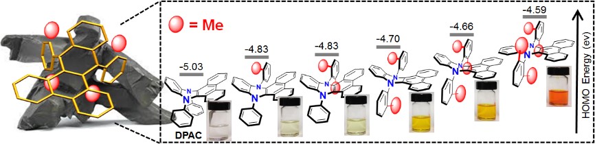 为此,他们巧妙地将甲基引入到母体DPAC的端基N,N'-二苯环的邻位上(图2所示),以此调控端基和二氢二苯并吩嗪之间的空间位阻,设计并合成了一系列邻位甲基衍生物。所有化合物的分子结构,均得到了单晶结构和理论计算最优化分子结构的双重证实。随着邻位甲基数量的增加,分子内空间位阻的强度也随之增加,从而导致V形的二氢二苯并吩嗪骨架逐渐从弯曲(~136°)变为近平面结构(~175°)。利用相对很小的甲基就实现了如此明显的变化,这正好契合了“四两拨千斤”的太极理论。一般来讲,在多环共轭分子的邻位引入大体积取代基会增加分子内空间排斥,会导致更大的构象扭曲。值得一提的是,这一工作逆向而为,首次实现了增加空间位阻以使多环有机共轭骨架逐渐由弯曲变为近平面。他们进一步研究了化合物的吸收放光性质。室温下,在甲苯溶液中,化合物的颜色随着邻位甲基数量的增加发生显著变化,从无色,浅黄色,黄色到橙红色(图2所示);但是,有趣的是,所有邻位甲基衍生物均放出与母体化合物DPAC一样的红色荧光,这表明它们在激发态过程中均振动到类似的近平面结构再放光。因此,邻位甲基衍生物的构型演变,成功模拟了VIE现象激发态平面化过程。这有助于加深对VIE机理的进一步理解。
