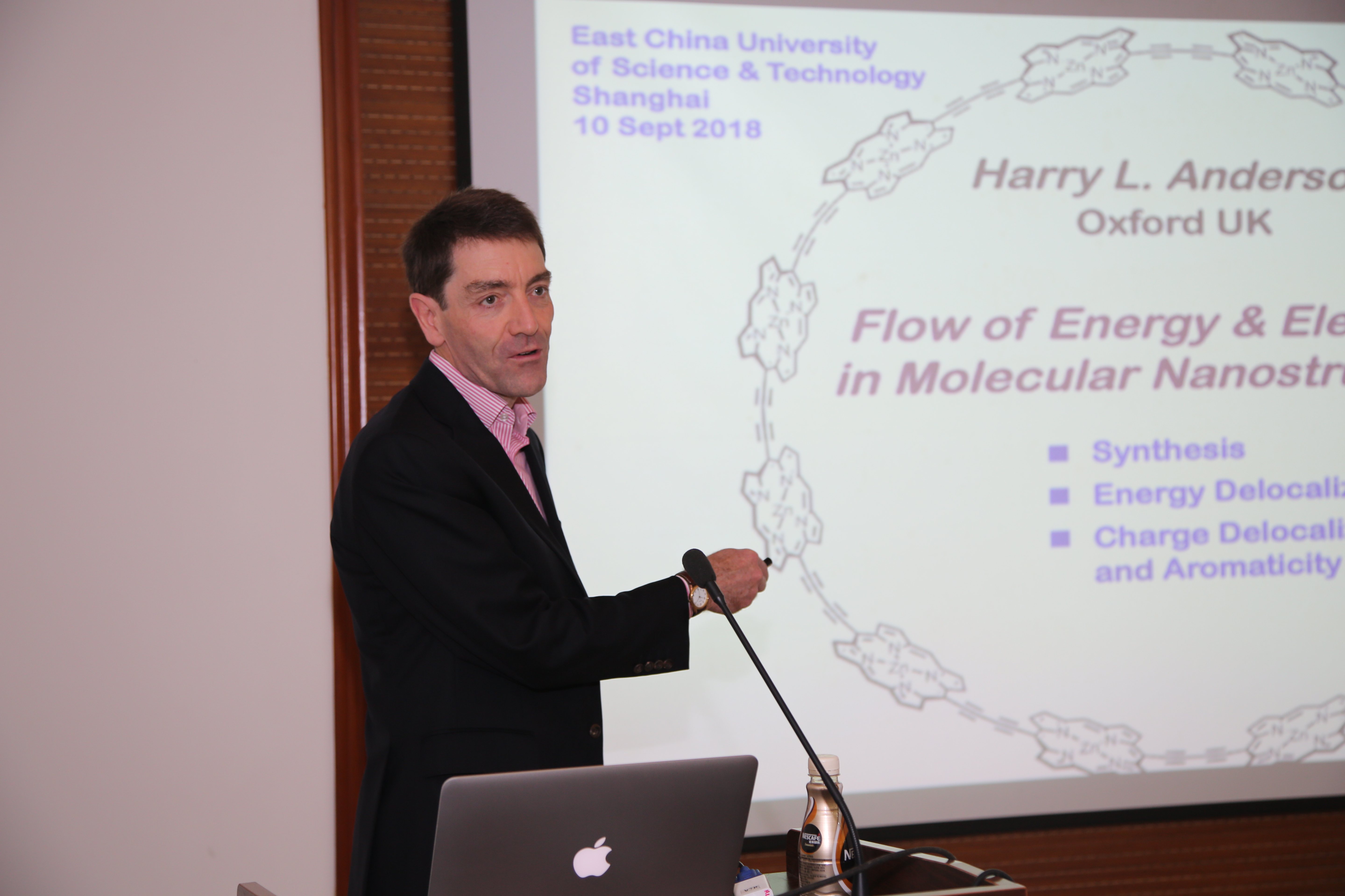 Anderson教授的报告精彩纷呈。他使用卟啉单体/低聚物和各种尺寸的分子模板,构建具有高通用性的卟啉纳米系统。这些超分子体系具有特异的光物理化学性质,在电荷转移、双光子吸、三线态电子顺磁共振、量子干扰、活细胞的非线性光学成像等方面表现出优异的性能。