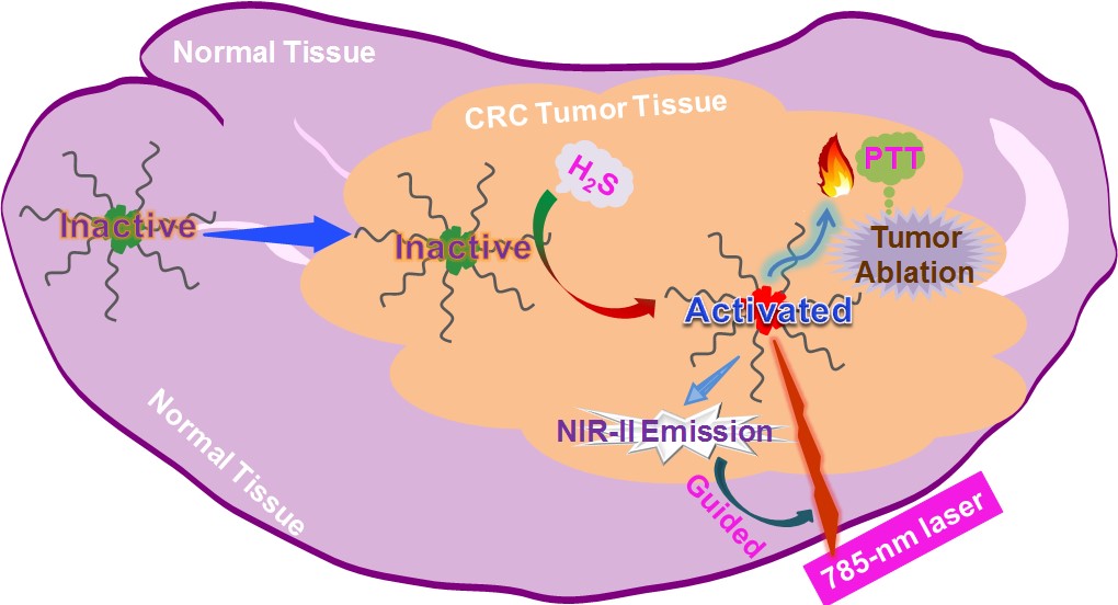 基于上述问题,研究人员创新的设计合成了一个硫化氢激活性(activatable)光热材料。硫化氢可特异性激活该纳米材料产生光热特性和近红外二区荧光,从而实现了硫化氢过表达肿瘤的靶向性光热治疗。该研究对开发新型肿瘤精准诊疗试剂具有重要的参考价值。