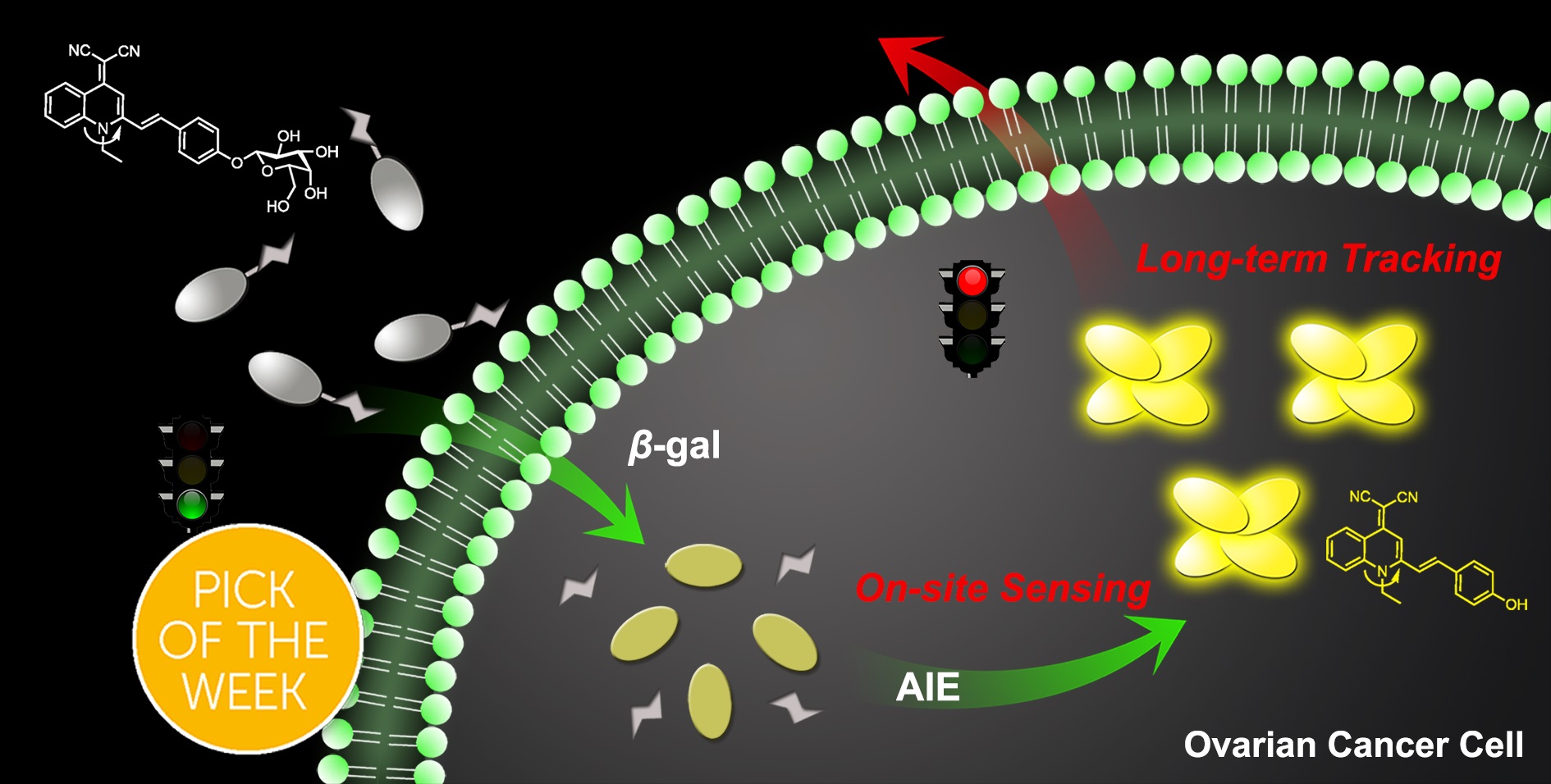 生物标志物(例如特定的生物分子和酶的活性)的原位检测和长时间示踪在疾病诊断中备受关注。最近,化学学院朱为宏教授和郭志前教授课题组发展了一种酶调控释放AIEgens策略,实现细胞中内源性β-半乳糖苷酶活性的原位检测和长时间示踪,在获取细胞内生物标志物的高保真信息研究中取得重要进展。相关研究成果以“An enzyme-activatable probe liberating AIEgens: on-site sensing and long-term tracking of β-galactosidase in ovarian cancer cells”为题在线发表于《Chemical Science》杂志上(Chem. Sci. 2018, DOI: 10.1039/c8sc04266g,原文链接:https://pubs.rsc.org/en/content/articlelanding/2018/sc/c8sc04266g#!divAbstract),并且被ChemSci Pick of the Week“Probing for answers on cancer”为题进行亮点报道(http://www.rsc.org/news-events/journals-highlights/2018/oct/probing-for-answers-on-cancer/)。