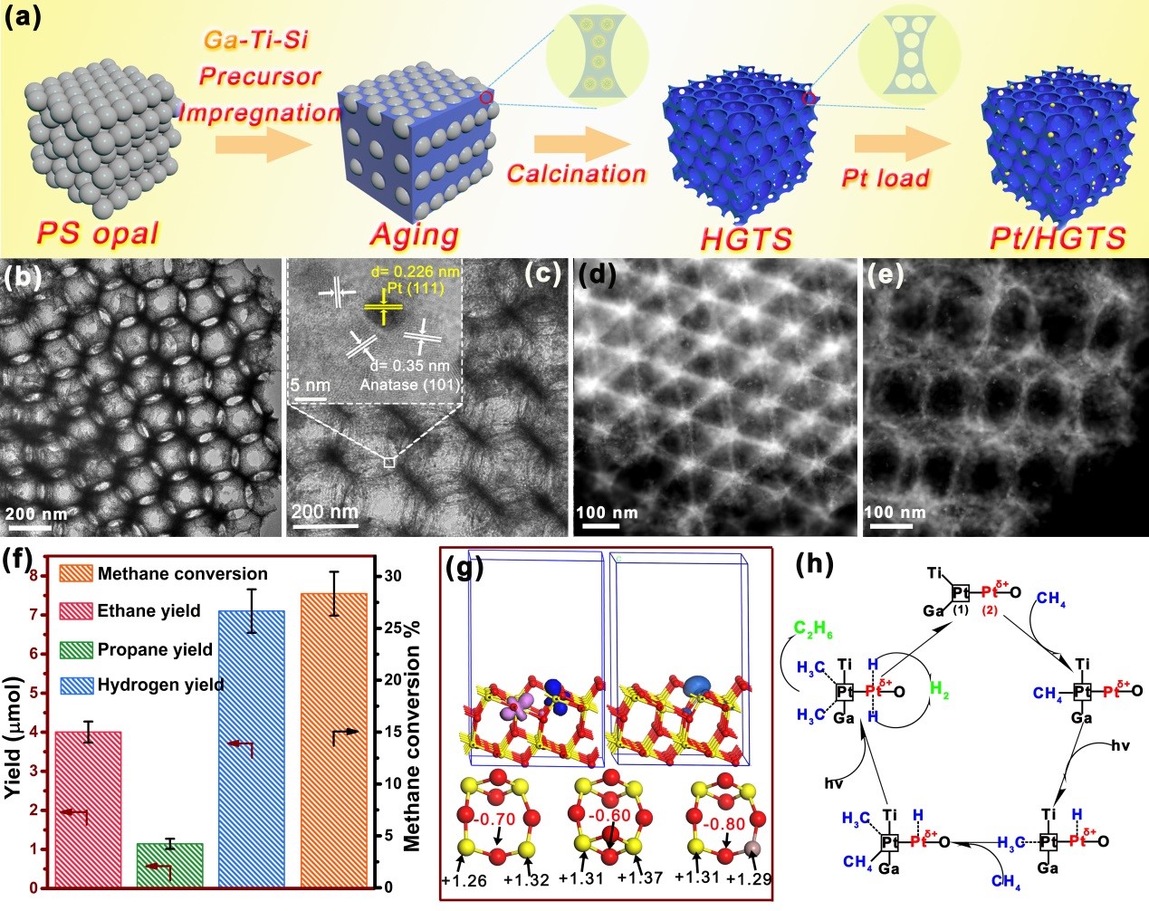 甲烷储量丰富,因其可转化为高附加值的碳氢化合物而被认为是可替代石油能源的资源之一。其中,甲烷非氧化偶联是甲烷转化的有效途径之一。然而传统热催化甲烷偶联耗能巨大,容易导致产物选择性低及催化剂的积碳失活,而光催化利用光能驱动反应,可大大降低反应温度,实现绿色能源转化。光驱动甲烷催化转化反应中,对甲烷进行有效活化及提高产物的选择性和稳定性一直以来都是研究的难点,缺乏对反应机理的深入研究。该团队利用镓掺杂及铂负载的多级孔氧化钛氧化硅材料作为光催化剂,在常温条件下,实现了高效光驱动甲烷转化,甲烷转化速率可达3.48 µmolg-1h-1,对乙烷的选择性达到90%。通过进一步机理探索,发现镓掺杂有利于稳定氧空位处的电子,促进正价铂的形成。正价铂更有利于C-H键活化,零价铂助光生电子转移,两者形成协同活性位点,促进甲烷的活化转化。本文为高效甲烷光催化剂的制备及改性提供了理论指导。