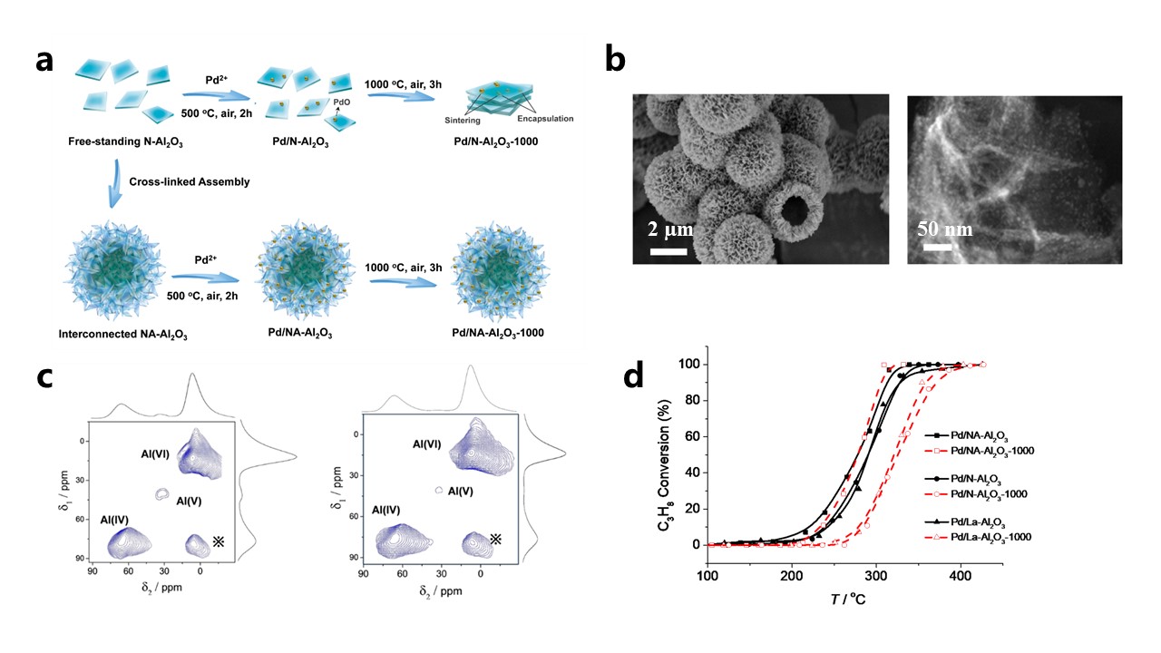 图1(a)纳米片和空心球等两种结构的Al2O3载体影响Pd活性位热稳定性的示意图;(b)Pd/NA-Al2O3催化剂的SEM和TEM图;(c)空心球结构Al2O3载体负载Pd前后的二维27Al MQ MAS NMR;(d)Pd/NA-Al2O3催化剂的丙烷催化燃烧活性(原料气组成:0.2 vol%C3H8+2 vol%O2/Ar,空速30 000 mL·h−1·gcat−1)