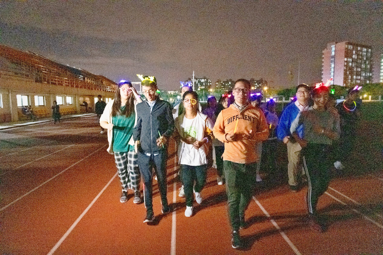 夜跑路线环绕奉贤校区的操场,领跑者在前带跑,身后星光闪闪。同学们在跑步中互帮互扶,为彼此加油打气。同学们放下手机,走出教室,离开寝室,在夜跑活动中充满了向上的朝气,上扬的嘴角、微笑的眼睛彰显了蓬勃的青春。