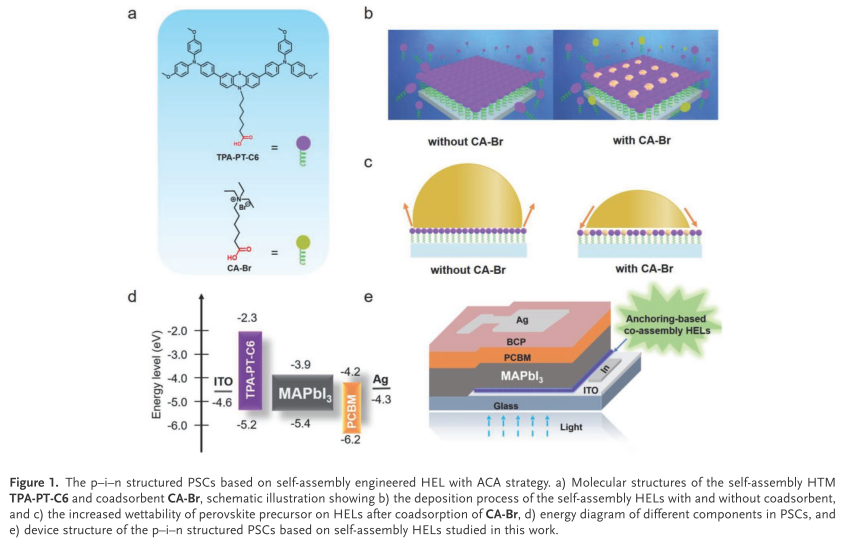 有机电荷传输层具有可低温溶液制备,适用于柔性器件等优势。但是,当前普遍使用的有机电荷传输层制备方法如旋涂法和蒸镀法等,存在着材料利用率低、大面积制膜不均匀等问题件。此外,有机薄膜表面具有很强的疏水性,从而导致钙钛矿膜的制备存在困难。该工作创新提出分子锚定共组装策略(anchoring-based coassembly, ACA),设计合成含有吸附基团的空穴传输分子(HTM)TPA-PT-C6和亲水性铵盐CA-Br,协同共组装于ITO电极上,制备高浸润均匀的空穴传输单分子层。CA-Br的引入不但能够调节空穴提取层表面能,增加钙钛矿前驱体的浸润性,改善钙钛矿膜的形貌和质量,还能有效钝化界面阳离子空位缺陷。基于该空穴传输层的p-i-n型的大面积 (1.02 cm-2)和模块电池(36 cm-2)分别获得了17.49%和12.67%的光电转化效率。