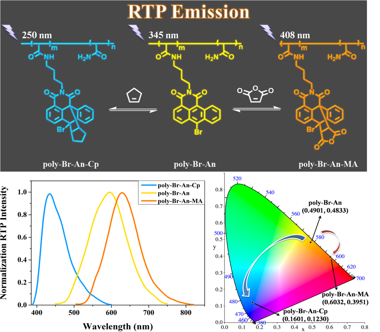 动态共价化学提供了一种制备具有反馈和响应功能的智能材料的方法,在过去的几年中引起了学者们的广泛关注。蒽二酰亚胺衍生物与丙烯酰胺共聚后形成发光团-丙烯酰胺共聚物(poly-Br-An),共聚物提供了丰富氢键的网络和刚性环境,有效的抑制了从T1态到S0态的非辐射失活过程,促进了室温磷光发射。在此基础上,通过Diels-Alder反应(二烯体与亲二烯体之间的[4+2]环加成反应)合成了两种聚合物,它们可以通过热可逆的动态共价键互相转化。三种聚合物显示出不同颜色室温磷光,实现了室温磷光蓝色-黄色-橙色的有效调控。该工作为通过动态共价键设计发光可调控的纯有机室温磷光材料提供了一种新策略。