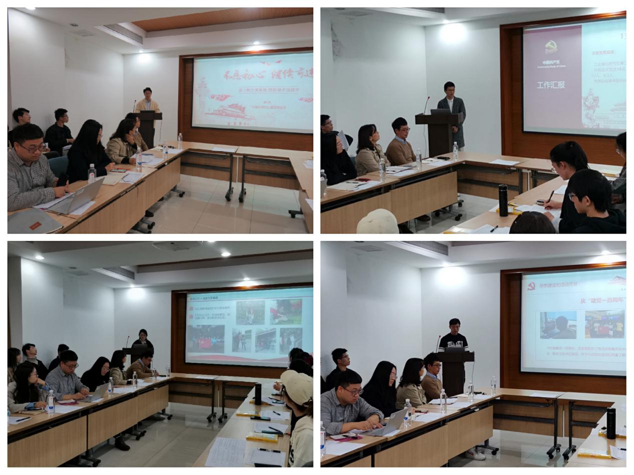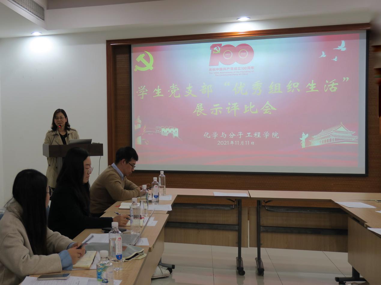会上,19个研究生党支部和2个本科生党支部分别展示了各支部在过去一年的典型组织生活案例,涵盖了党员发展、主题活动、红色参观等不同类型,全方位地呈现了学生党支部的组织生活情况。有的支部以建党百年为契机开展了“电影党课”,“行走党课”,“朋辈党课”等丰富多彩的活动,有的支部党员作为“党史小讲师”分享学习心得体会,有的支部把“我为群众办实事”实践活动作为抓手,担任志愿者参与到爱心义卖、“化学与艺术”课堂等活动中。最终,评委们根据支部日常工作情况和现场展示情况进行了评分,产生了7个优秀学生党支部。