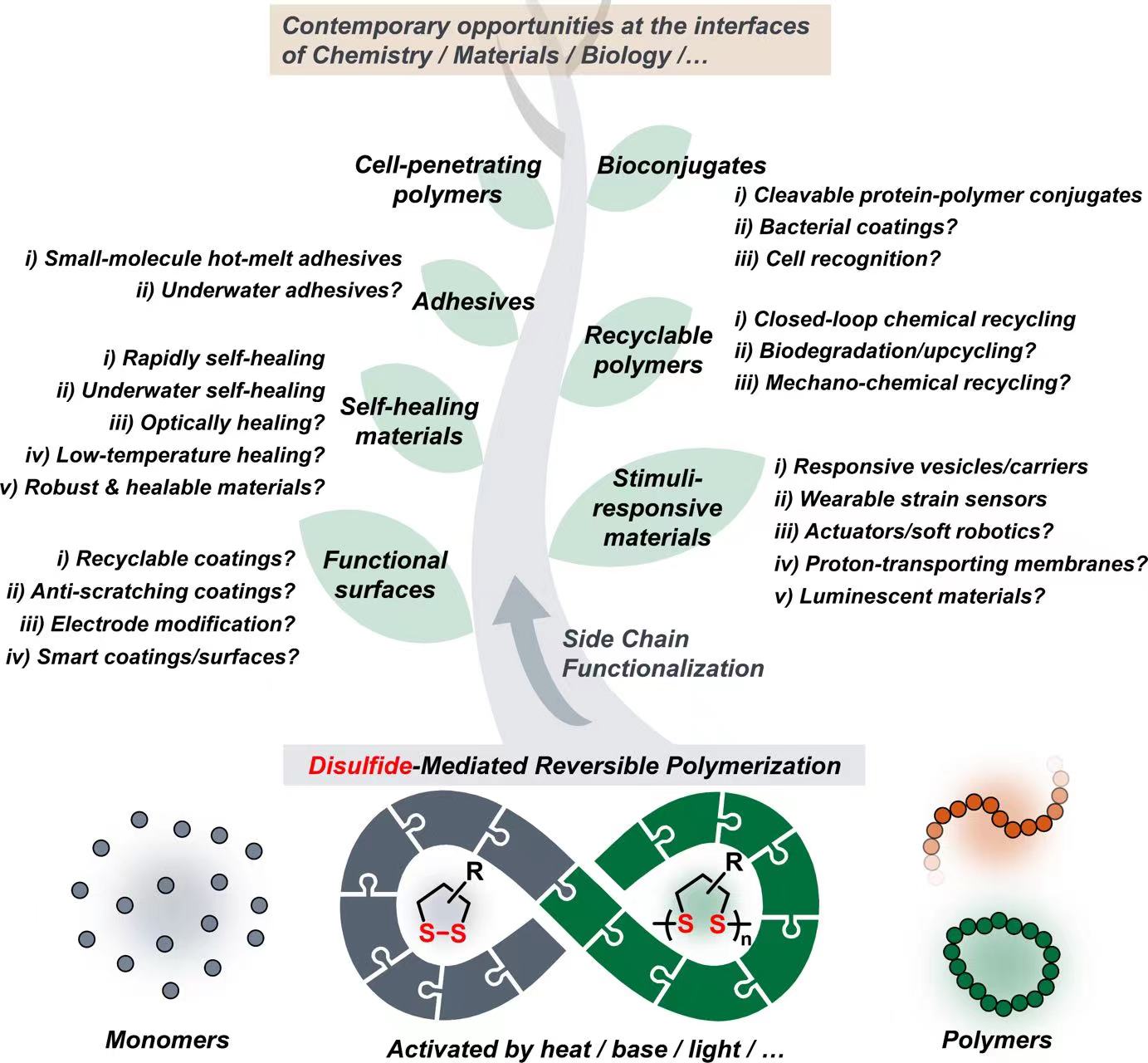 该文章以“动态二硫可逆开环聚合”为切入点,首先回顾了poly(disulfide)s这类聚合物自上世纪50年代被首次发现以来在聚合物合成方法学上的重要事件,从最初的分子量不可控的氧化聚合、光化学聚合、热聚合方法,再到近年来国内外同行连续取得进展的硫醇阴离子引发的可控开环聚合。这些基础研究成果奠定了poly(disulfide)s的聚合方法学,使得这类动态聚合物的可控制备成为可能。