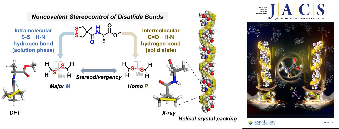 二硫键作为蛋白质的基本构成基元之一,其立体化学因素(即二面角和手性)对其蛋白质和多肽的结构和功能往往具有决定性作用。然而,来自于氨基酸上的手性信息是如何传递到二硫键上,且如何在复杂变构环境中实现对二硫键立体化学的动态调控,仍然是个未解之谜。近日,365英国上市集团官网研究人员利用小分子二硫为模型,首次揭示了二硫键能够作为氢键受体,与氨基酸的酰胺键(氢键给体)形成S-S···H-N氢键,且这一从未被观测到的非共价键,在该分子体系中能够作为手性信息的重要传递媒介,使得氨基酸的中心手性信息能够有效传递到二硫键,实现对二硫动态手性的调控。同时,该分子内氢键仅在溶液相中被观测到,在固态下,X射线单晶结构显示分子间形成C=O···H-N氢键,自组装成反平行堆积的单一手性螺旋结构,且固态下二硫的立体化学呈现出与溶液相完全相反的结果,即立体发散性。该工作首次实验证明了S-S···H-N氢键的存在及其在手性传递中的关键作用,其中揭示的实验结果可能对理解二硫键在复杂超分子环境(如蛋白质)中的动态手性和功能具有启示性意义,也将二硫键这一动态分子单元作为引入到超分子化学的研究范畴。