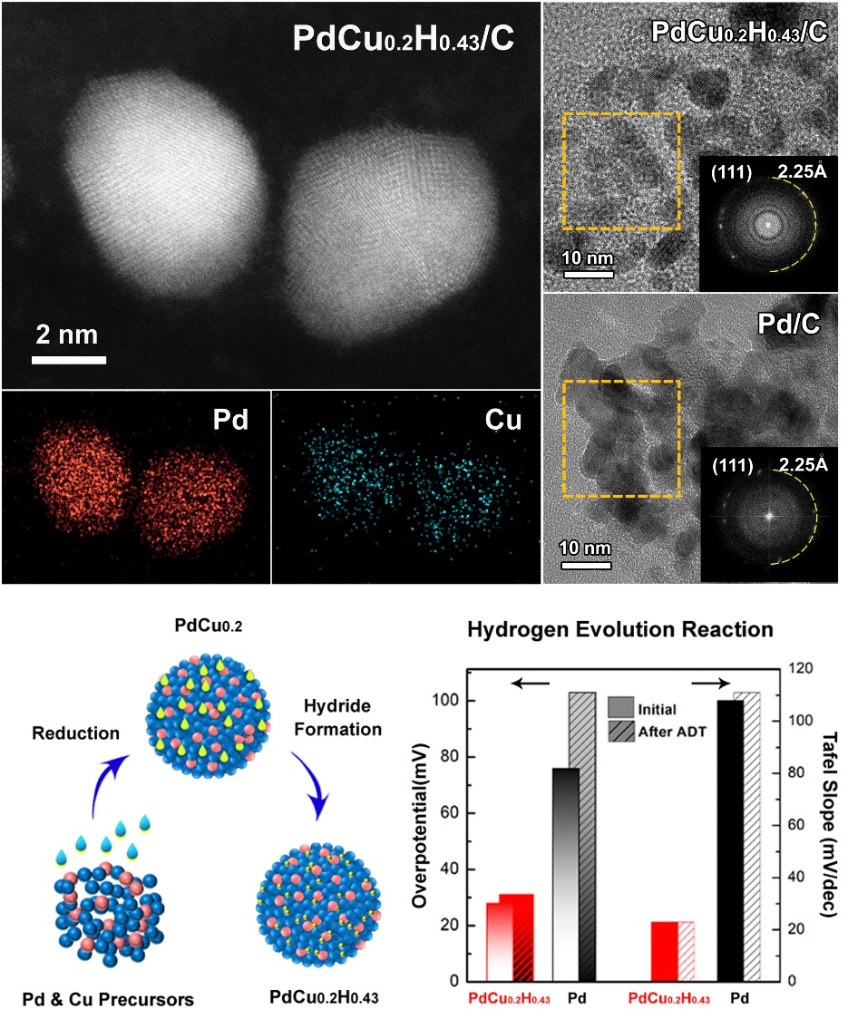 Pt作为传统的HER催化剂,面临着价格昂贵,储量少,反应稳定性差等问题。Pd作为有望替代Pt的HER催化剂,一直受到较多的关注,例如,通过加入第二金属(M)形成Pd基合金(Pd-M);或者在Pd晶格内注入H形成氢化物(PdHx),都可有效提高Pd基催化剂的HER活性。然而,Pd基催化剂的稳定性制约了其在析氢催化反应的进一步应用,Pd-M合金催化剂中的第二金属M易在反应过程中发生溶解造成合金结构坍塌;PdHx氢化物则通常由高压条件下制备所得,常压下不稳定,自发释放H。作者巧妙结合了Pd-M和PdHx两种策略的优势,设计合成了Pd基合金氢化物Pd-Cu-H催化剂,表现出了优异的HER催化活性和极好的稳定性。