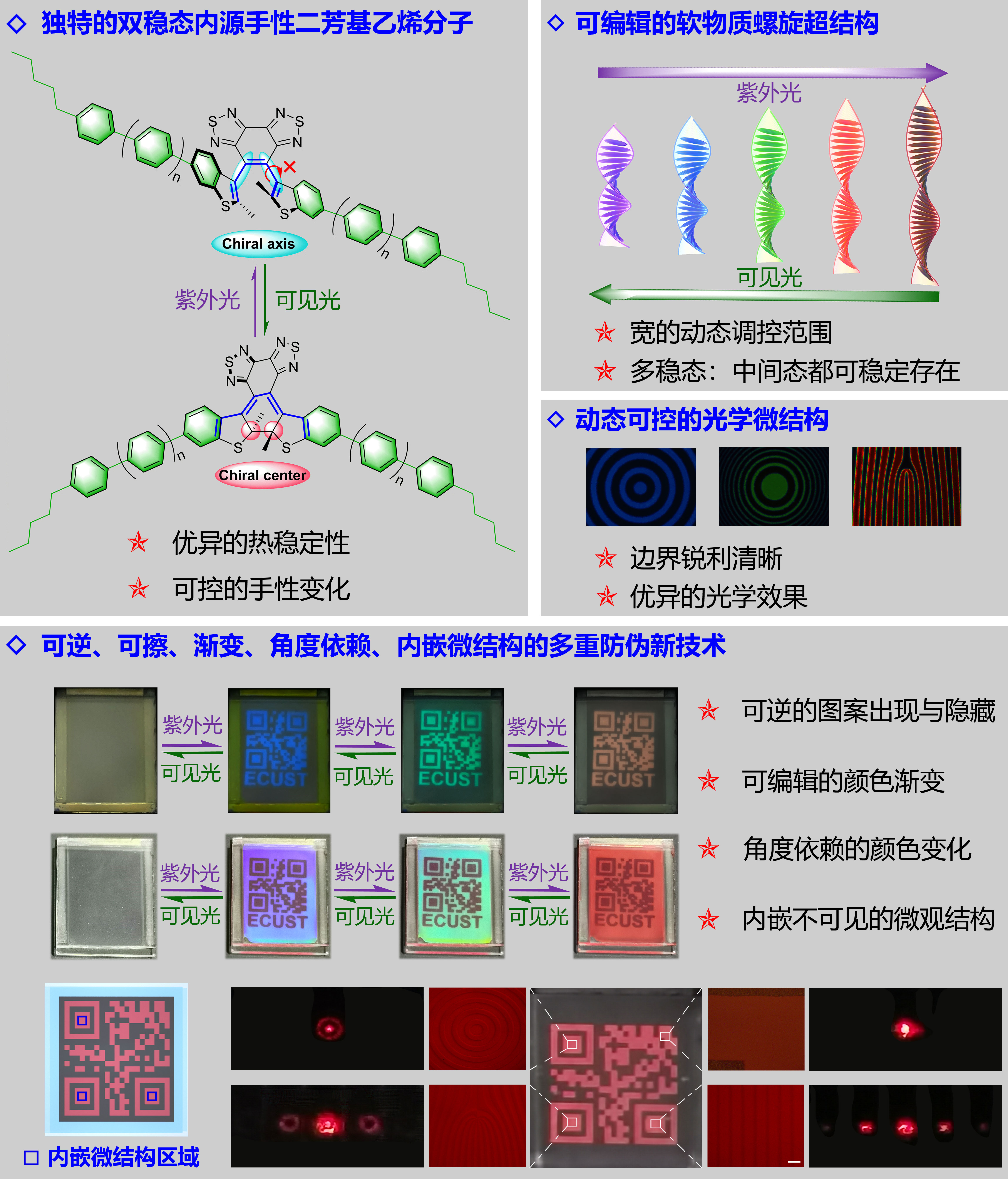 为了解决上述问题,该工作基于朱为宏课题组所发展的独特“位阻性烯桥光控体系”,发展了一类双稳态内源手性二芳基乙烯分子。与外接手性基团所带来的手性调控相比,内源手性的转变仅来自于开环体的轴手性与闭环体的中心手性之间的变化,非常有效地避免了含有多手性源的非对映异构体的产生,从分子设计源头创新解决了液晶微腔中的多畴结构问题。此外,通过在侧链修饰类似液晶单体的结构单元,进一步提升了光控分子与液晶的相容性、螺旋扭曲变量(HTP)、热稳定性以及抗疲劳度。该类内源手性光控开关完美解决了软物质光子学中动态调控范围窄、结构稳定性弱、抗疲劳度差、光散射和光谱畸形等问题,突破性地实现了从近紫外到近红外区的宽范围、多稳态、强抗疲劳度的动态调控,并开创了可逆、可擦、渐变、角度依赖、内嵌式微结构的多重防伪新技术,有力推进了防伪领域新时代的发展。