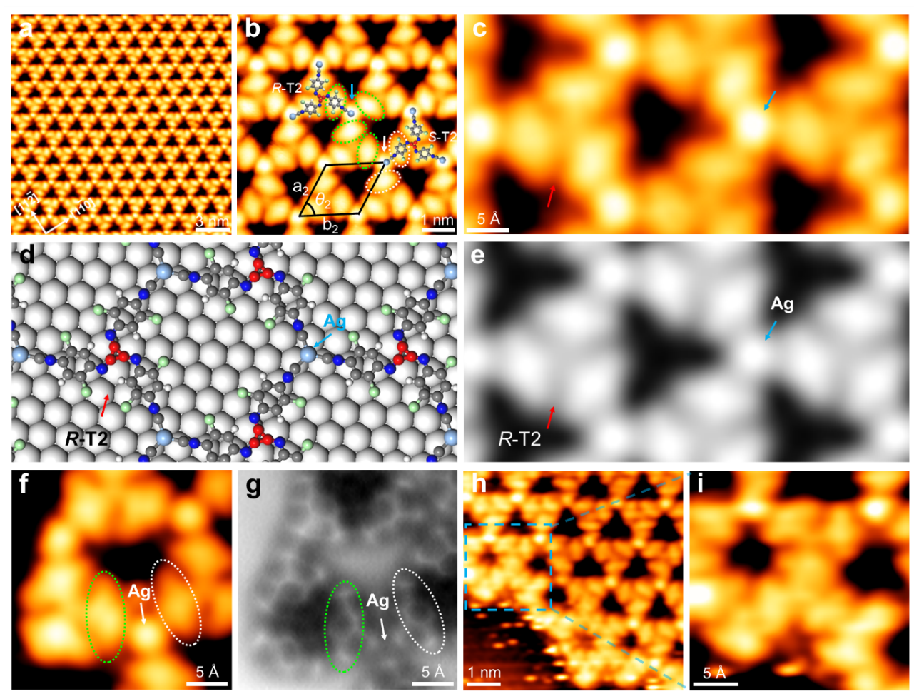 为了合成由氮杂三轴烯分子基元组成的二维分子体系,作者进一步设计合成了包含有两个异氰基的前体分子1,4-二氯-2,5-二异氰苯(DCDICB)。将DCDICB沉积在Ag(111)表面上形成了具有三角孔型二维结构。进一步通过STM、nc-AFM和DFT的结合,确定了三角孔型结构是由氮杂三轴烯分子基元通过三重对称的C3−Ag联接结构形成了金属-有机网格(图4)。此外值得注意的是,在三角孔型金属-有机网格的边界处,也观察到了由多个氮杂三轴烯分子基元共价连接的低聚物。