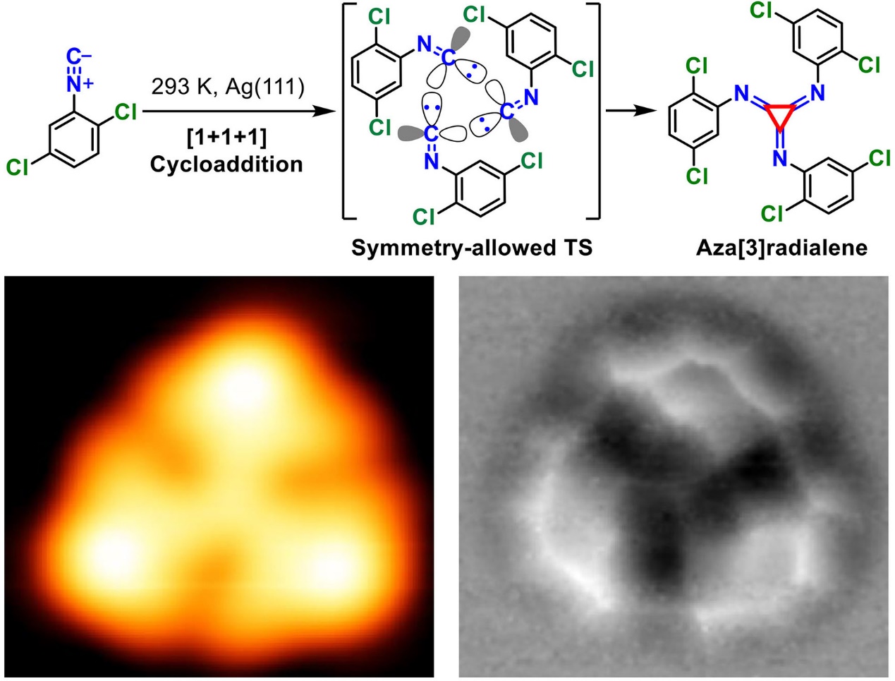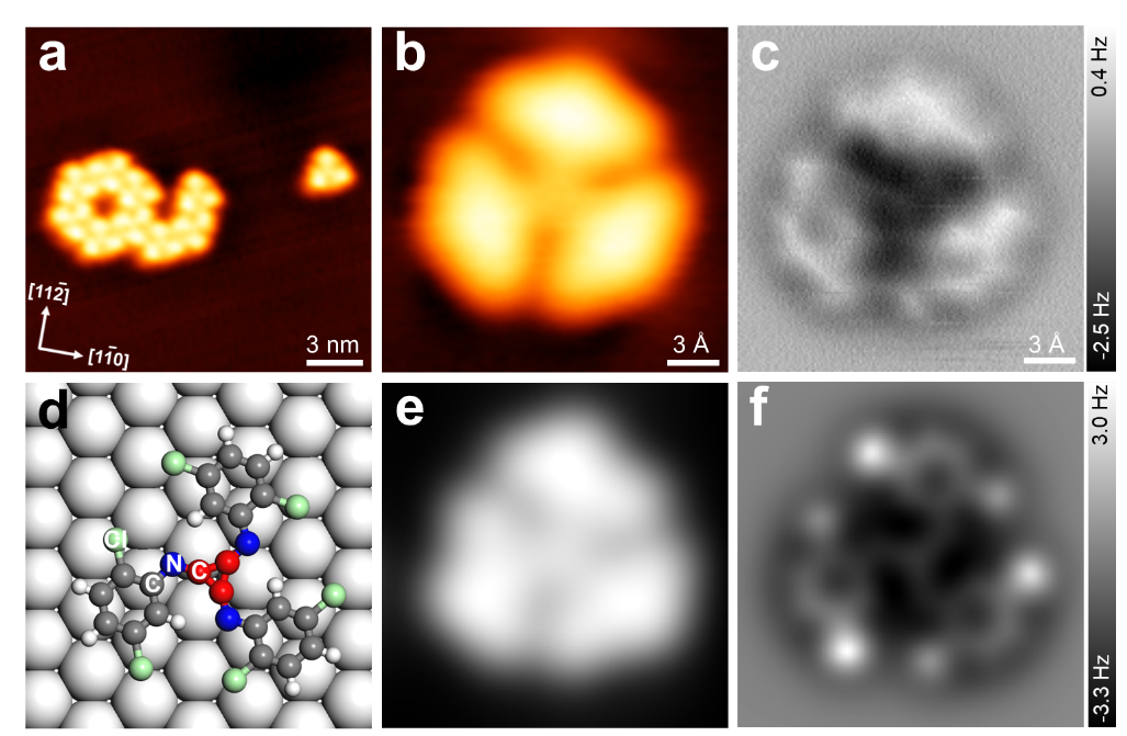 首先,选用1,4-二氯-2-异氰苯(DCICB)为反应前体分子,Ag(111)为限域表面。在超高真空条件下,将DCICB蒸镀到室温的Ag(111)基底上,通过扫描隧道显微镜(STM)和非接触原子力显微镜(nc-AFM)在超高的化学键分辨率下对[1+1+1]环加成反应的产物进行化学结构的实空间精确表征,并通过飞行时间二次离子质谱(ToF-SIMS)确定了产物的分子量,结合密度泛函理论(DFT)计算证实了产物的化学结构和立体构型(图2)。