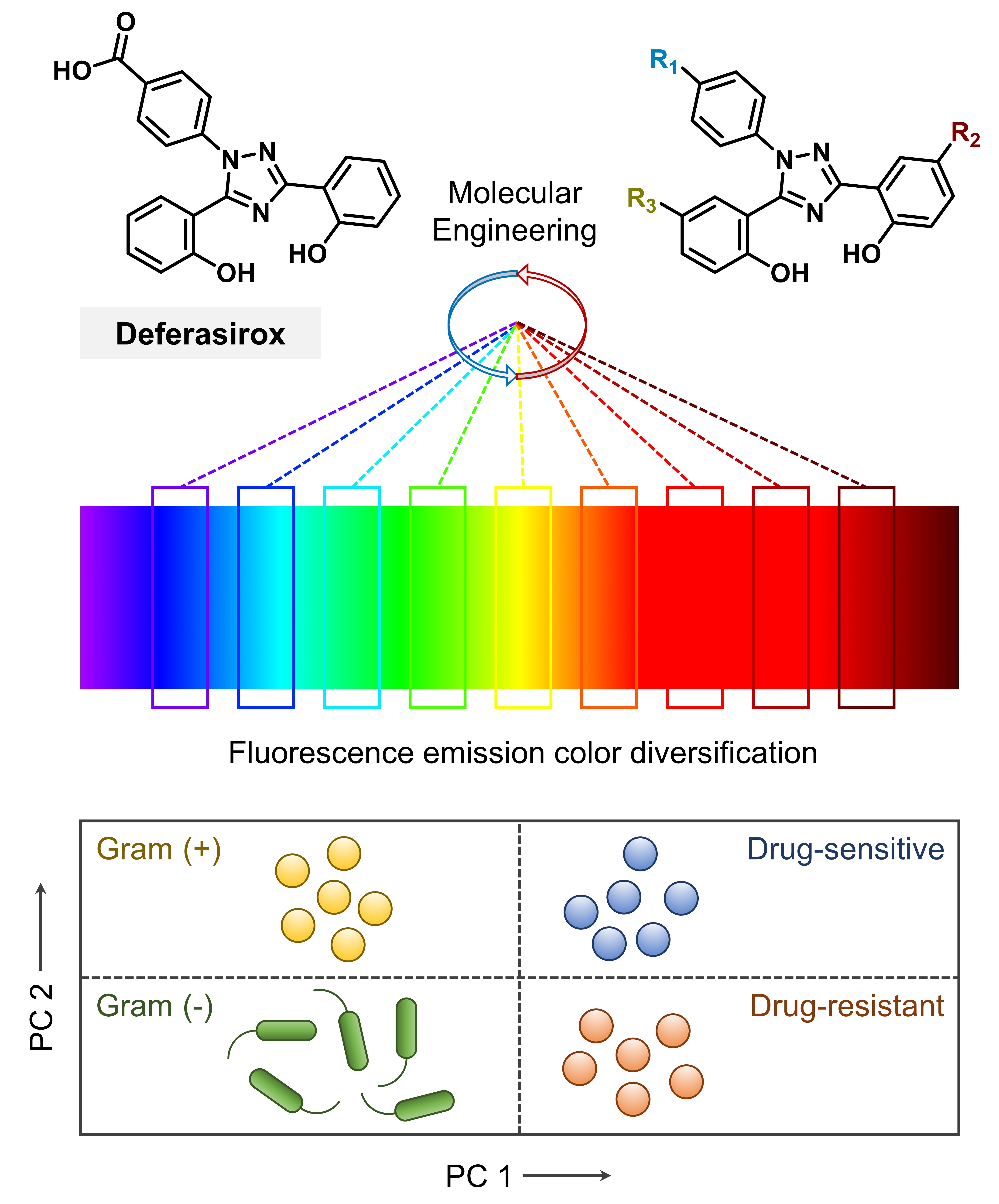 在上述研究基础上,团队进一步对ExJade的多个苯环取代位点进行化学修饰,通过调控母体结构的电子供受体效应,构建了荧光发射几乎涵盖全可见光谱带的ExJade衍生物库。理论结合实验研究表明,这些衍生物在水溶液中表现出包括聚集诱导发光(AIE)、激发态分子内质子转移(ESIPT)和电荷转移等在内的混合发光机制,并可通过与三价铁离子的螯合猝灭本征荧光。荧光成像实验表明,该系列衍生物可实现细菌的多荧光通道成像,且与商业细菌染料Syto 9不串光,为细菌的精准可视化研究提供了新的化学工具。此外,团队还构建了基于ExJade多色荧光衍生物库的细菌传感阵列,针对细菌对该系列衍生物不同的内化动力学,以及衍生物对细菌内源性三价铁离子差异化的荧光猝灭动力学,选取最大荧光差异窗口获得该阵列对不同细菌的高通量特征识别信号,继而应用主成分分析法对获取信号进行降维分析,成功实现了革兰氏阳性菌和阴性菌,临床分离耐药菌和药敏菌,以及经药物诱导产生不同耐药性金黄色葡萄球菌之间的精准区分,从而为临床超级细菌的快速甄别提供了一种高效、简易的新型化学探测工具。
