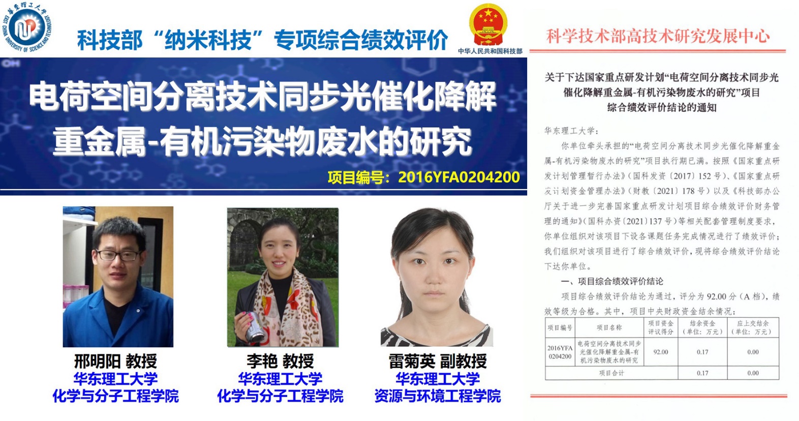 科技部重点研发计划“纳米科技”重点专项2021年结题项目已于2022年2月完成了综合绩效评价工作,365英国上市集团官网牵头的“电荷空间分离技术同步光催化降解重金属-有机污染物废水的研究”青年项目(项目编号:2016YFA0204200,项目负责人:邢明阳教授;项目骨干:李艳教授、雷菊英副教授)获得了92分(A档)的综合绩效评分,顺利通过结题考核。