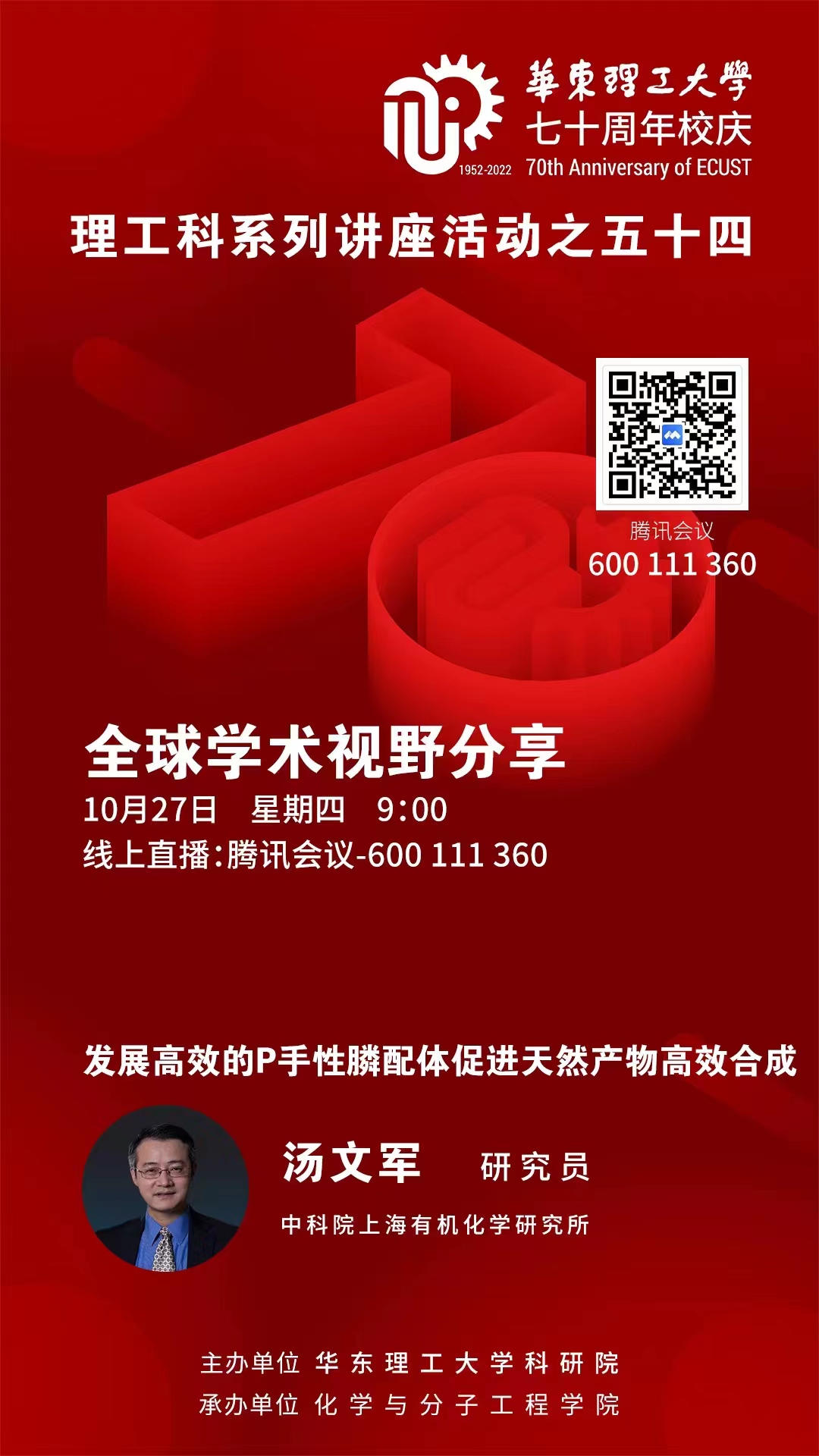 为迎接学校七十周年华诞,特邀请365英国上市集团官网1991级校友上海有机所汤文军研究员云端相聚,欢迎各位老师同学积极参加。