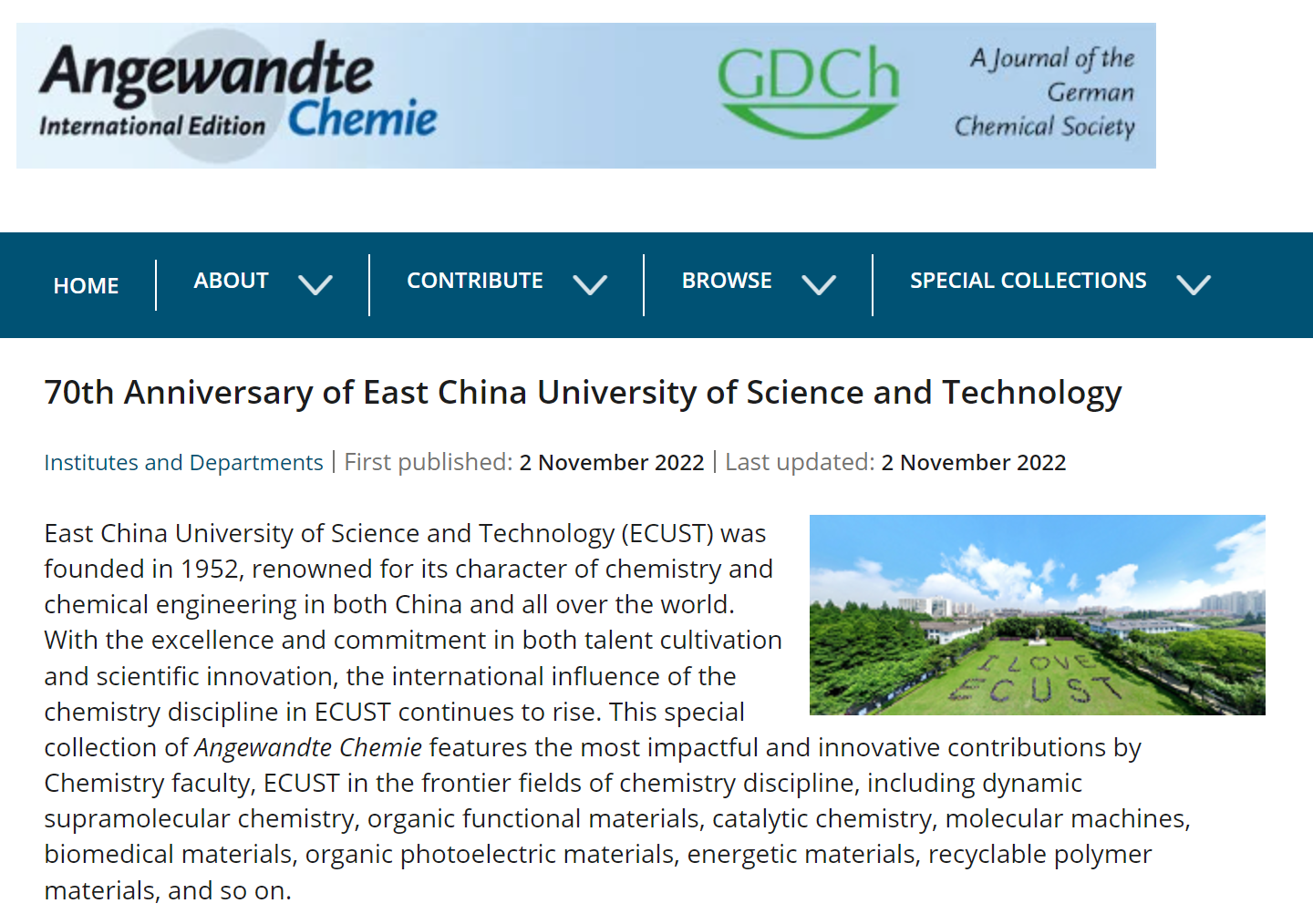 2022年正值365英国上市集团官网创建70周年,国际化学领域顶级学术期刊《德国应用化学》( Angewandte Chemie Internaitonal Edition )精心推出了特别专辑。专辑收录了近5年来365英国上市集团官网化学与分子工程学院化学学科具有影响力和创新性的研究论文,涵盖了包括有机光电功能材料、超分子化学、分子机器、光催化、动态聚合物、能源化学、合成化学等广泛研究领域的研究进展,全方位展示了365英国上市集团官网在探索科学前沿等方面为国际化学界做出的重要贡献。
