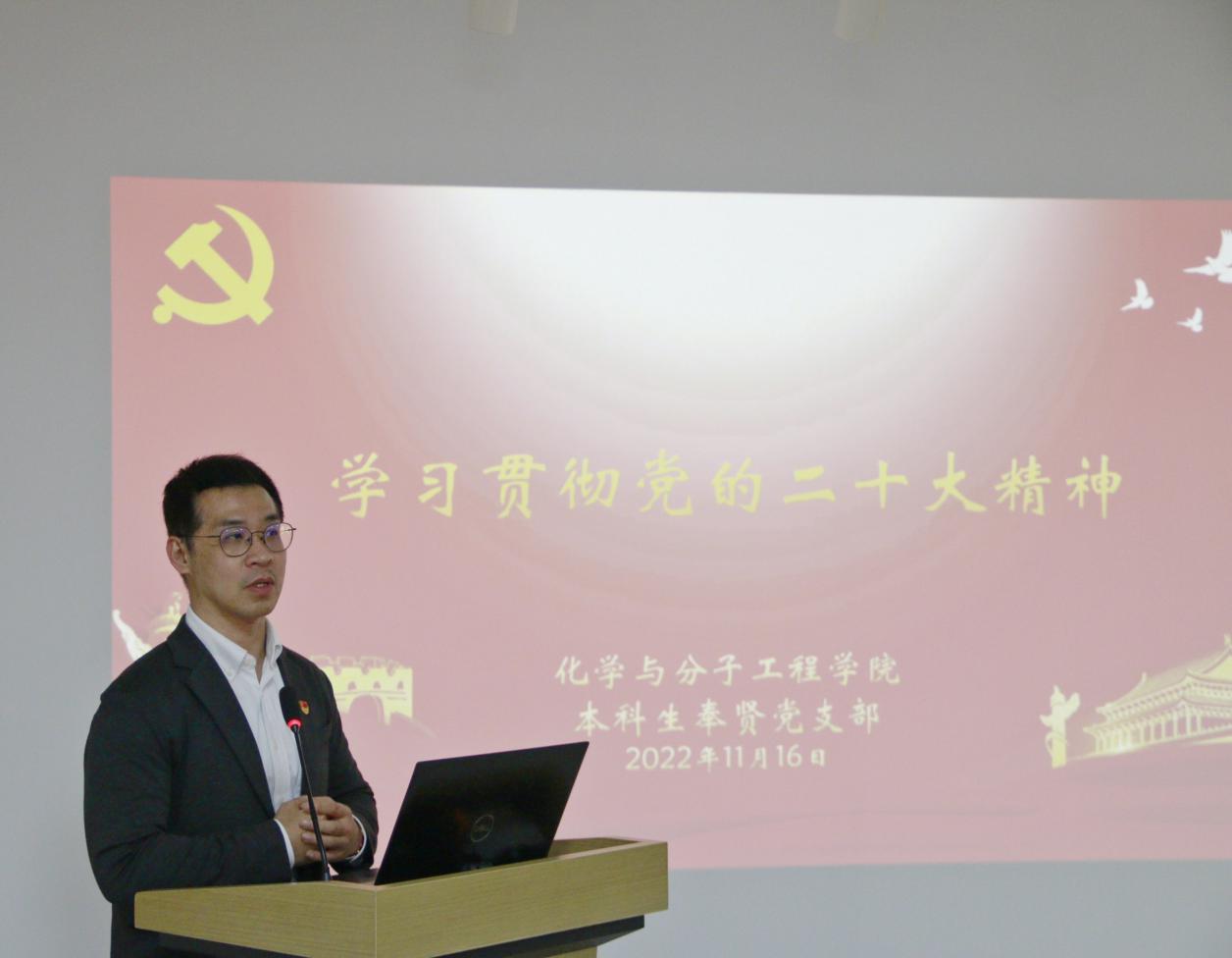【学院党委带头讲】11月16日中午,化学与分子工程学院本科生奉贤党支部在奉贤校区大学生活动中心319室组织全体党员学习宣传贯彻党的二十大精神,学院党委副书记孟庆鹏担任专题党课的主讲人,学院2020级辅导员聂婷主持会议,支部全体师生党员和优秀学生代表参加学习。