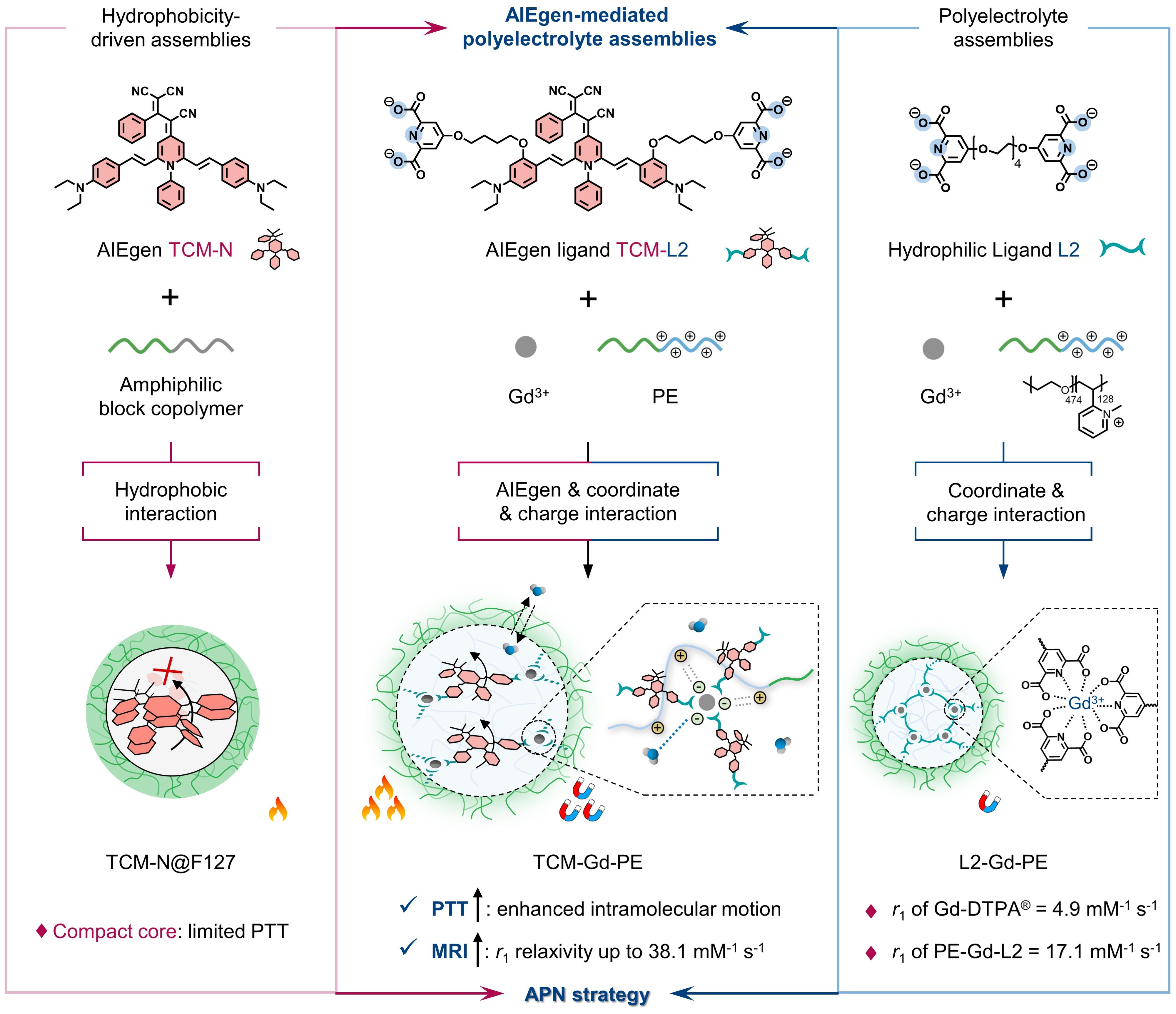 近日,化学与分子工程学院郭志前教授课题组报道了一种基于AIE染料构建的聚电解质组装体新策略(AIEgen-Mediated Polyelectrolyte Assemblies,APN策略)。在APN策略中,以聚集诱导发光染料(AIEgen)配体(TCM-L2)、磁成像金属离子(Gd3+)和聚阳离子-中性嵌段共聚物(P2MVP128-b-PEO474)为构筑单元,通过金属配位作用和离子的相互作用,三组分在水溶液中可迅速组装为尺寸均一的纳米聚集体(TCM-Gd-PE)。该APN设计策略具有普适性,可用于构筑系列金属离子、多种嵌段共聚物的聚电解质纳米体系。与疏水作用力驱动的纳米体系截然不同,基于APN策略所获得的组装体具有特殊的“柔软”、水相的内部微环境,在纳米的限域环境中实现了精准操控分子内运动和MR弛豫率协同增强(图1),相关研究成果以“Fluorescent Probes Based on AIEgen-Mediated Polyelectrolyte Assemblies for Manipulating Intramolecular Motion and Magnetic Relaxivity”发表在《德国应用化学》,并被选为VIP(very important paper)论文。