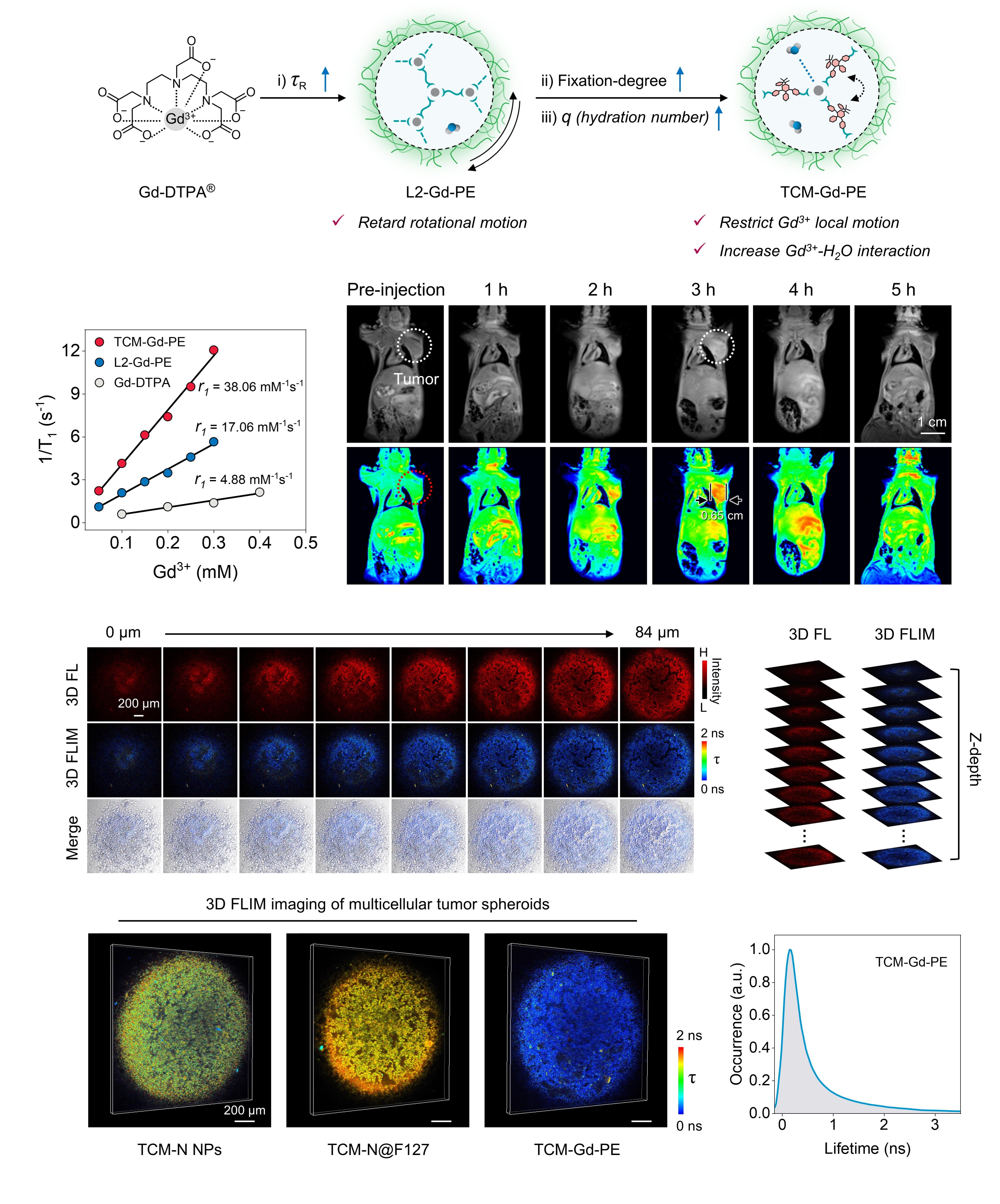 图3. APN纳米探针MR弛豫率增强机制;MRI引导的高效光热治疗;多细胞肿瘤球三维荧光寿命(3D-FLIM)成像