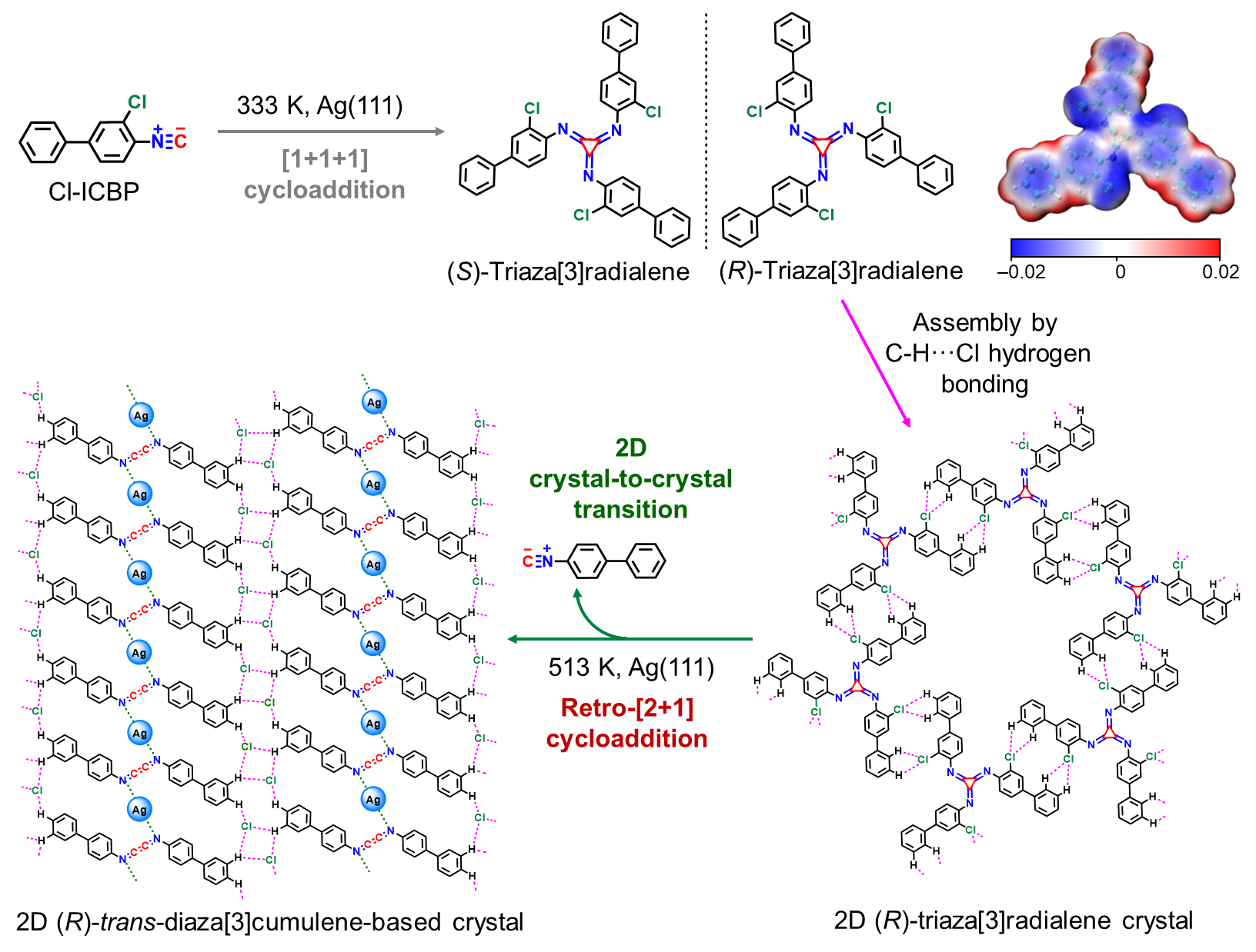 近日,365英国上市集团官网化学与分子工程学院刘培念教授/李登远副教授课题组通过异腈的表面[1+1+1]环加成反应,原位制备了基于C–H···Cl氢键作用的二维三轴烯晶体,并发展了高化学选择性和立体选择性保持的逆-[2+1]环加成反应,实现了从异腈向三轴烯到累积三烯二维晶体的定向转化(图一)。通过扫描隧道显微镜(STM)和非接触原子力显微镜(nc-AFM)直接观察到了多种二维晶体转变过程中的关键反应中间体,并结合理论计算阐明了逆-[2+1]环加成反应涉及到三元碳环的开环、次序性的脱氯/氢钝化和脱异腈的过程,并且三轴烯到累积三烯二维晶体转化是一种逐步外延生长机制。