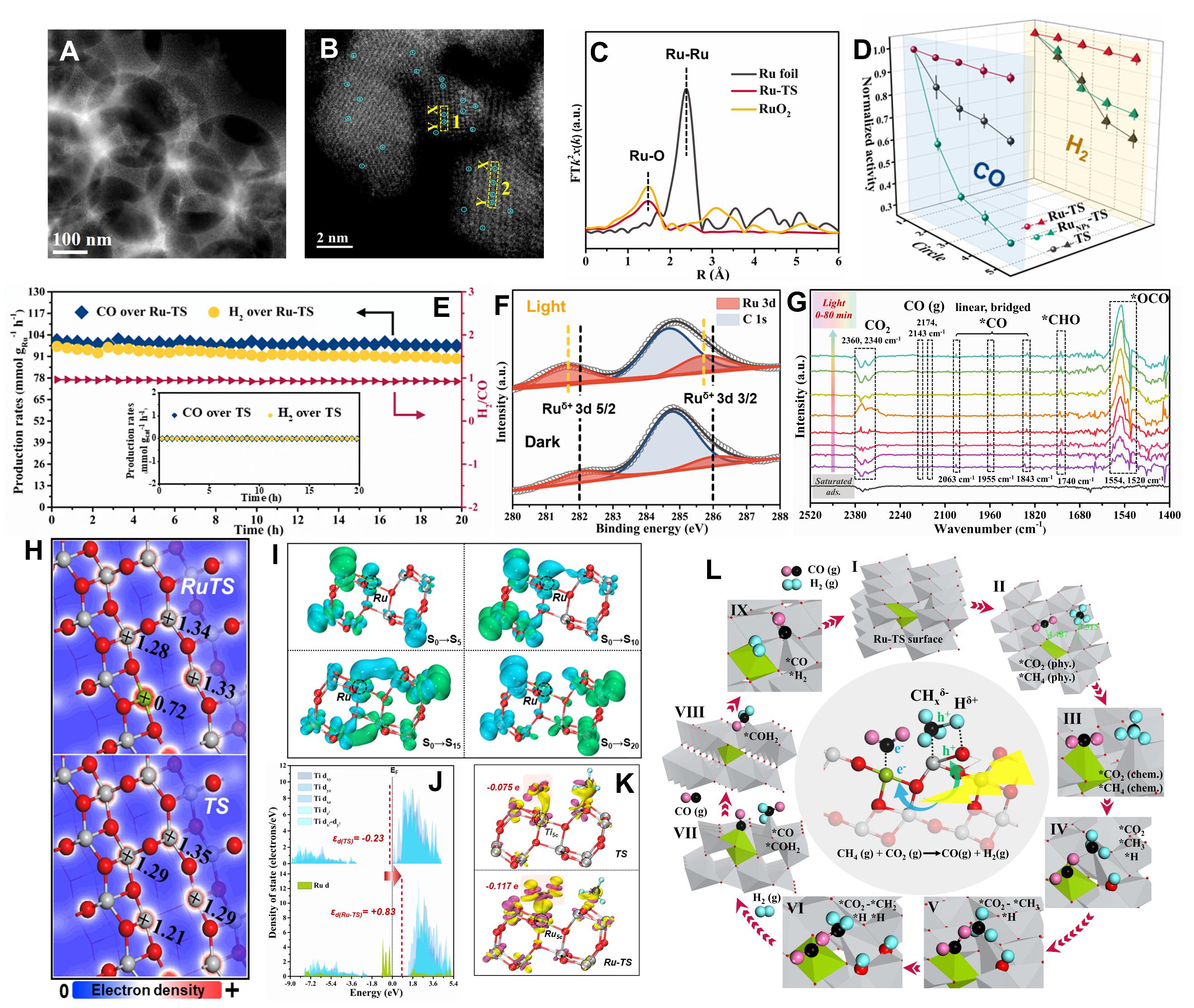 基于以上挑战,张金龙教授团队以Ru单原子修饰的TiO2-SiO2多级孔光催化剂(Ru-TS)为模型(图A-C),于分子水平探究了CH4和CO2的匹配转化机制,通过合理调控H2/CO比例,在温和条件下实现了高效、稳定的甲烷干重整,合成气生成速率高达195.02 mmol gRu-1 h-1(图D-E)。该研究利用原位实验监测不同样品的关键反应中间体,为DRM和其副反应路径计算提供依据(图F-G)。研究结果发现,反应决速步形成的三键桥连*OH中间体吸附于Ru-TS表面,促进CHx与CO2的有效耦合和连续转化,有助于提升反应稳定性;而TS表面形成的*COOH中间体经过加氢反应,产生了副产物水和积碳,主产物H2/CO比例偏低,催化剂发生失活。基态和激发态理论计算进一步表明,Ru5c-Ov-Ti4c结构单元是调控DRM反应路径和产物比例的关键。其中,Ru单原子诱导局部电荷分布,并作为光生电子的定域中心,促进CO2分子的吸附与活化;氧空位(Ov)为反应物分子转化和中间体形成提供空间;酸度提升的Ti4c位点与光生空穴协同作用,有效拉伸甲烷C-H键(图H-L)。该研究阐明了基于CO2-CH4匹配活化理论的单原子体系设计原理,深入解析了光激发下活性位点的电荷分布对优化DRM反应路径的影响,为多分子协同反应光催化剂的结构设计提供了指导。