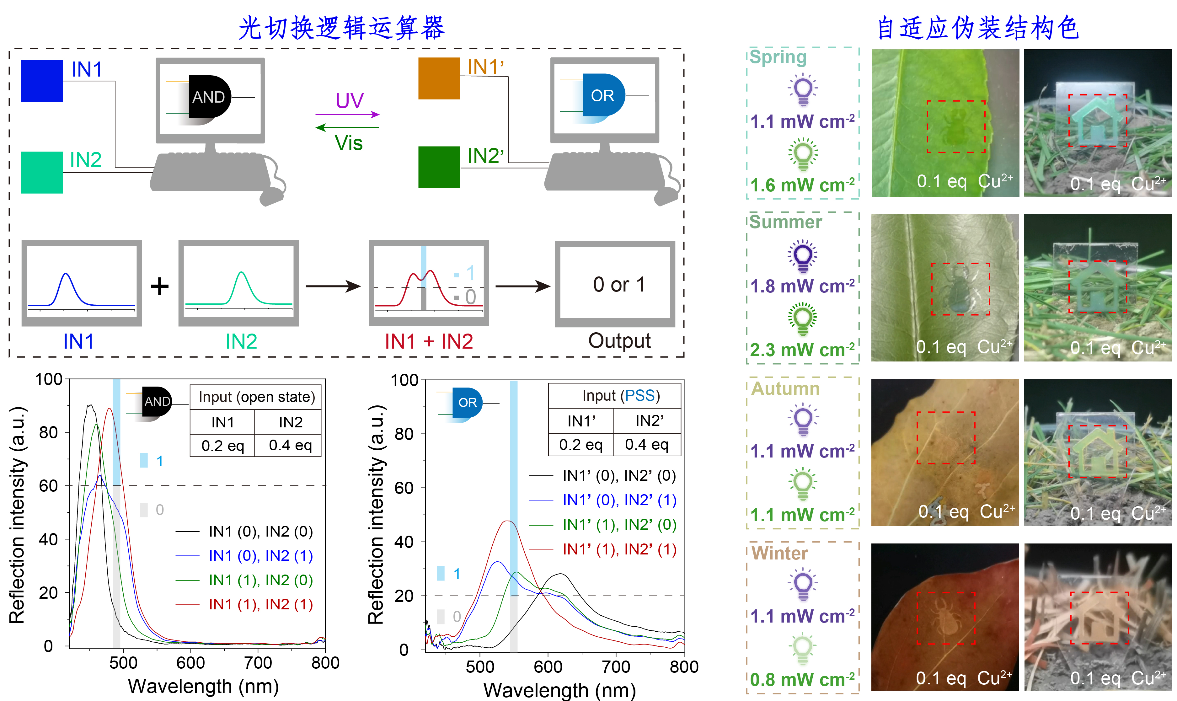 基于多自由度光调控液晶螺旋超结构,进一步设计开发多自由度可控的平面光子器件。通过输入端反射光强双耦合,设计了一种“AND”和“OR”逻辑单元之间的光可切换逻辑运算器件,为逻辑运算芯片的微型化和多功能性提供了新的概念,在集成光学器件中具有广阔的应用前景。此外,得益于光敏性可控的液晶螺旋超结构,通过调控铜离子浓度和光照强度,实现了随季节颜色变化的自适应伪装结构色(“甲虫”和“房子”)(图2)。该自适应伪装超结构的概念验证,不仅为解释生物行为背后的物理结构和分子系统机制提供了生动直观的技术依据,而且为丰富生物和环境自适应功能材料提供了有效策略。