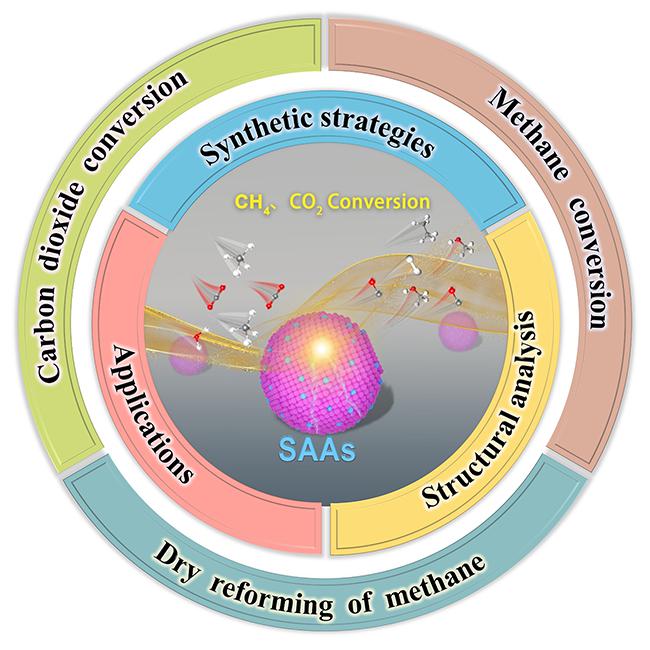 “碳中和”背景下CO2和CH4两种温室气体的催化转化是近年来催化领域的研究热点。然而,CO2和CH4都属于惰性分子,具有高解离能和低极化性,难以活化转化。迄今为止,研究者们一直致力于构建用于甲烷和二氧化碳转化的高性能催化剂,包括异质结、合金、单原子材料以及其他新型材料。考虑到传统单原子催化剂中活性原子的高利用率和合金材料中多金属间的协同效应,单原子合金(SAA)将两者的优势相结合,被证明可以提高特定环境中的催化性能及稳定性,成为了一种具有前景的催化材料。与非金属载体上的孤立金属位点相比,SAAs中的单原子位点因受到宿主金属的电子结构调控而更加稳固,与宿主原子位点的协同作用而更适合于多分子催化反应过程。与传统合金相比,SAAs在保持类自由原子电子特性的同时,最大限度地提高了活性原子利用率。此外,由于反应物分子的活化和中间体的吸附往往处于SAAs的不同金属位点,从而可以打破反应活化能与吸附能的线性比例关系,提升催化转化效率。尽管SAAs材料在CO2和CH4催化转化中展现了独特的优势和广阔的前景,然而,构建SAAs结构实现CO2和CH4分子的高效活化和产物选择性调控仍具有挑战性。