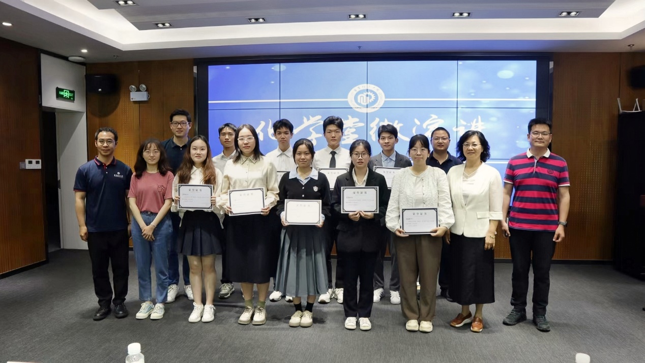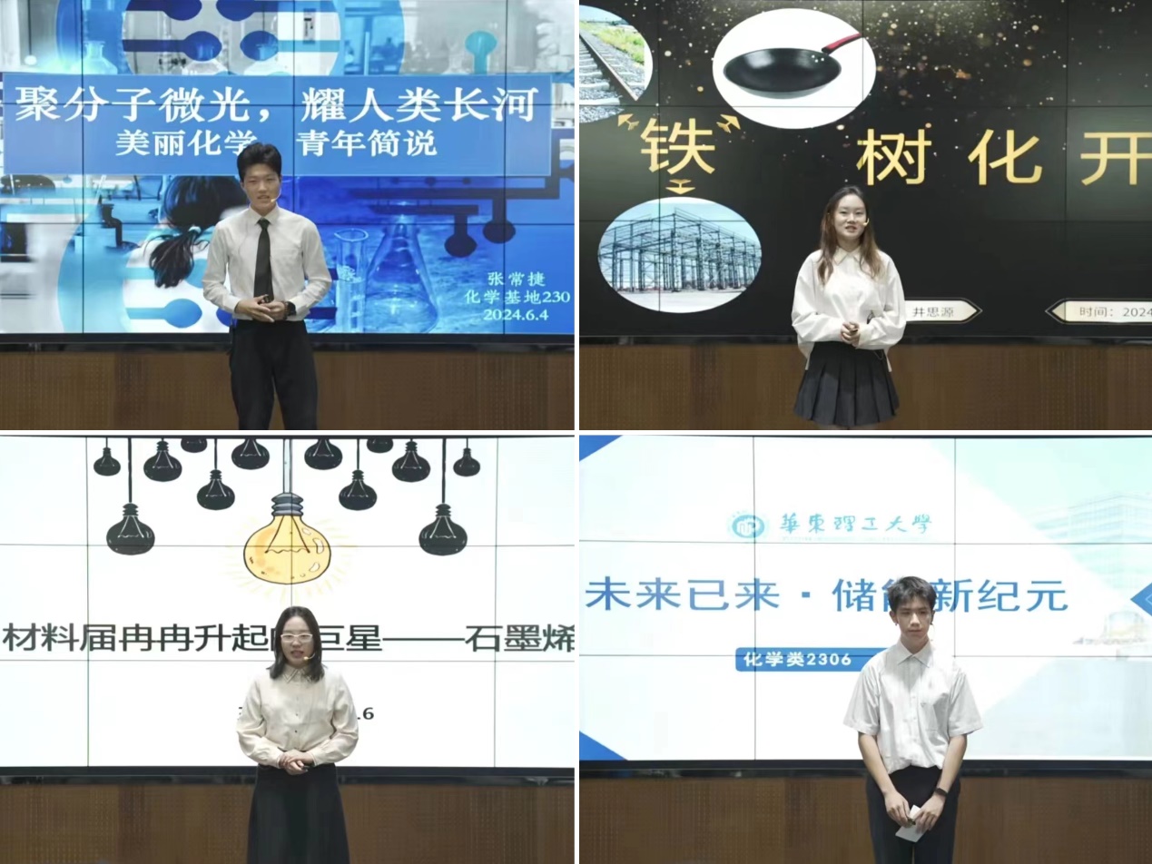 参赛学生紧扣“青年简说·美丽化学”主题,围绕化学及相关领域研究前沿,结合自己的研究课题探索化学学科的美丽奥秘,兼具科学性和思想性。化学类2305班张帅喆同学,以“出淤泥而不染”为演讲主题,带领同学们探究界面化学的奥秘。化学基地230班张常捷同学介绍了发光染料的原理和实际应用,使同学们对发光染料有了更为全面的了解。化学基地220班王婕同学生动而全面的介绍了石墨烯材料,激起了同学们对“新材料之王”石墨烯的兴趣。化学类2306班董元同学带领同学们进入超级电容器的世界,领略它的分类结构、应用和未来发展。化学类2305班井思源同学详述了铁元素的奥秘,谈科学也聊科幻,深入浅出,趣味十足。化学基地230班李鼎文同学围绕纳米量子点材料,展示了色彩斑斓的纳米世界与现代化学的技术革新。化学类2304班顾俣涵同学追溯氟橡胶的发展历程,让同学们从老一辈科研大师蒋锡夔身上感悟科研报国。应化212班杨依静同学阐述了卟啉的结构与应用、研究历程和合成方法。化生(双)210蔡奕轩同学讲述靛蓝的历史和制法,展现了传统手工业内应深奥化学原理、外合传统自然美学。同学们的精彩演讲不仅展现了元素风采和材料魅力,也追溯了化学发展历程,关注了化学前沿热点,在讲好化学故事的同时,发掘和传递化学之美。