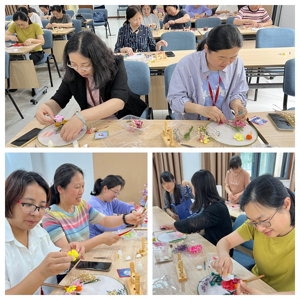 通过摆型、修剪、粘黏,老师们几乎无师自通,一朵朵干花、一簇簇绿叶,在大家的轻声细语、笑声晏晏中,在无尽的创意和想象力下,慢慢地在小小的团扇上展现出了独特风采,原本素白的扇面渐渐被点缀成一幅幅精美作品。这些团扇不仅展现了每位老师的精思巧意,也寄托了大家对美好生活的向往和追求。