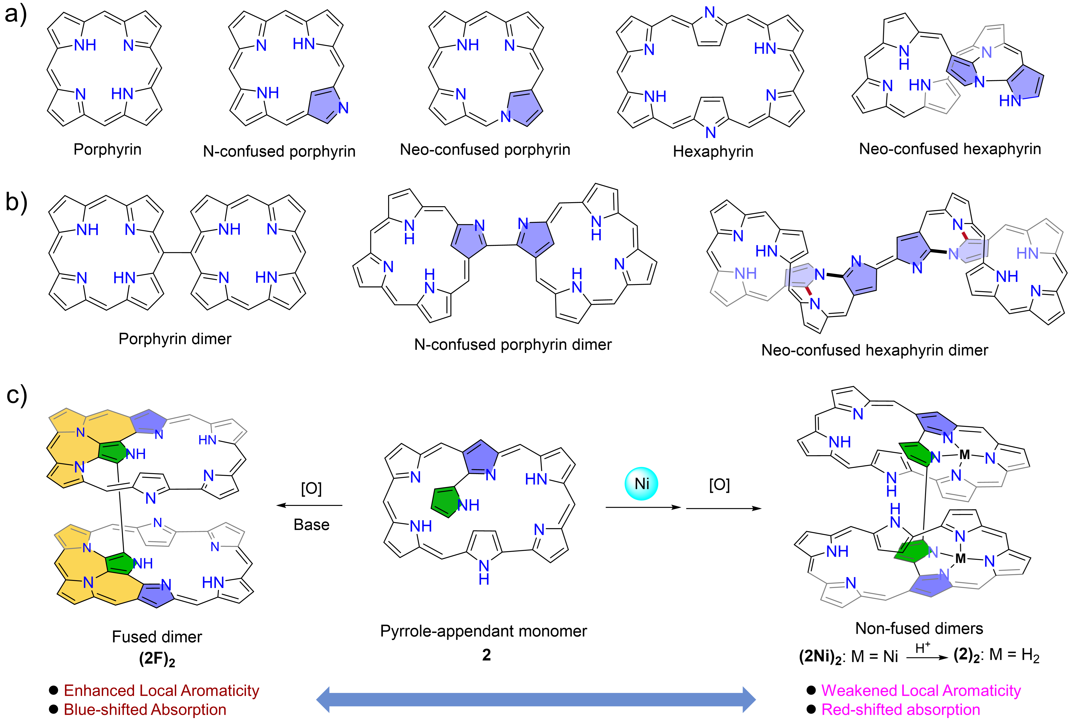 卟啉广泛存在于叶绿素、血红素等自然界功能体系,具有突出光电性能,被誉为“生命色素”。通过改变卟啉大环母体结构则可以得到的卟啉类似物异卟啉 (porphyrinoids),往往具有更加丰富独特的结构与性能 (图 a)。作为典型的异卟啉,扩展卟啉包含更多的吡咯单元,具有灵活丰富的构型、大共轭路径、可控的芳香特性、近红外吸收、多金属配位等独特性质。将两个卟啉单元连接形成的卟啉二聚体,具有更为独特的性质,如分子内能量/电子转移、双光子吸收、非线性光学等性能,可应用于诸多领域 (图 b)。但对于扩展卟啉来说,其二聚体仍然缺乏有效的合成策略。这主要是源于传统的扩展卟啉往往缺乏高选择性的活性连接位点或存在较大分子间位阻作用,不利于构筑相应的二聚体。