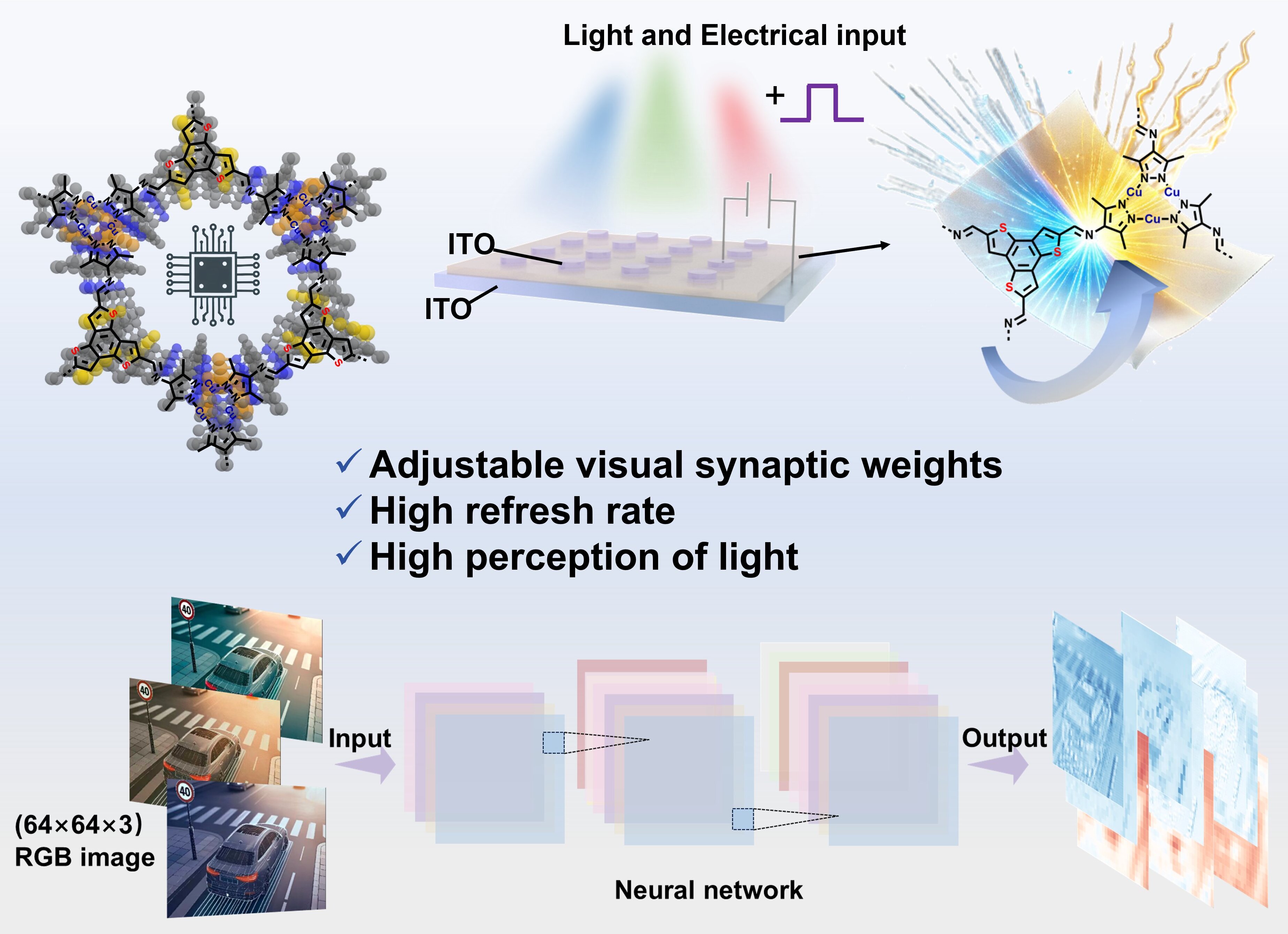 人工视觉神经系统通过整合图像感知、存储与计算功能,已成为突破冯·诺依曼瓶颈的潜力解决方案。基于现有光电忆阻器受限于需要特定波长或长时间输入才能维持稳定性能的缺陷,研究团队开发了一种苯并噻吩修饰的共价有机框架材料。该材料通过中等供电子基团(苯并三噻吩)和氧化还原活性基团(甲基三核铜)的有序限域分布,显著提升了甲基三核铜在低压(0.2V)氧化还原过程中的光电响应性能。快速的弛豫时间,结合电导的协同光电化学调制,即使在高速快门条件下,也能在短时间内有效地进行原位图像识别和存储,在弱光、浓雾及高频运动场景下实现识别精度的显著提升。该人工视觉神经系统经训练后,识别准确率从初始2种导电态时的7.1%跃升至87.1%。通过光电化学协同作用实现的50种导电状态使该器件的图像刷新率高达400 Hz。这种构建策略与光电相互作用的协同效应,为开发能即时原位处理环境信息的光电神经形态计算元件提供了新路径。研究成果以“Donor-redox covalent organic framework-based memristors for visual neuromorphic system”为题发表于InfoMat上,化学学院博士研究生张琼珊为论文第一作者,上海市智能感知与检测技术重点实验室张斌教授为通讯作者。