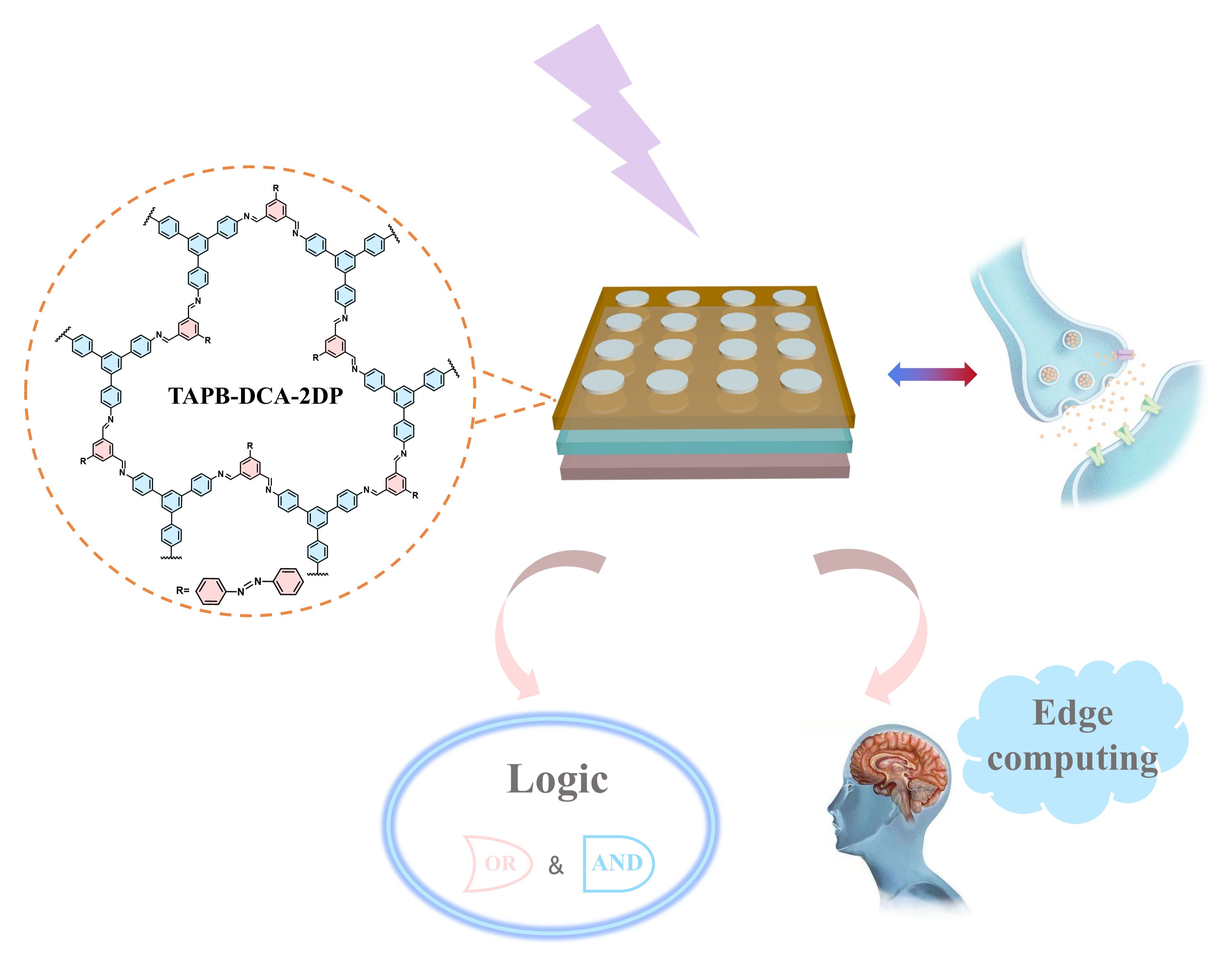 人工突触器件的开发对于神经形态计算的发展至关重要,因为它旨在使用忆阻器等电子组件来模拟大脑的突触可塑性。传统的电子和光电器件面临着高能耗和硬件冗余等缺陷,全光子调制器件因其超快运行、无电互连功率损耗和高带宽而引起了广泛关注。研究团队通过界面聚合法合成了一种大面积二维高分子薄膜TAPB-DCA-2DP。这种二维高分子包含偶氮苯基团,其暴露于紫外光和蓝光条件下会发生反式-顺式异构化,从而赋予该材料光响应特性。基于该二维有机薄膜材料的全光忆阻器成功模拟了神经突触的关键功能,如成对脉冲促进/抑制和长期增强/抑制等。此外,全光忆阻器有效地执行了光学逻辑门和ASCⅡ码解密,并成功集成到新型边缘计算系统中,用于导电玻璃的损伤检测。该系统准确地对各种类型的损坏进行了分类,在卷积运算期间以32个电导状态下实现了98.03%的识别准确率。相关研究成果以“All-optical synaptic devices utilizing 2D polymer film for logic operations and integrated edge computing”为题发表于Cell Reports Physical Science上,化学学院博士研究生李金勇为论文第一作者,上海市智能感知与检测技术重点实验室张斌教授、胡越副教授和轩福贞教授为共同通讯作者。