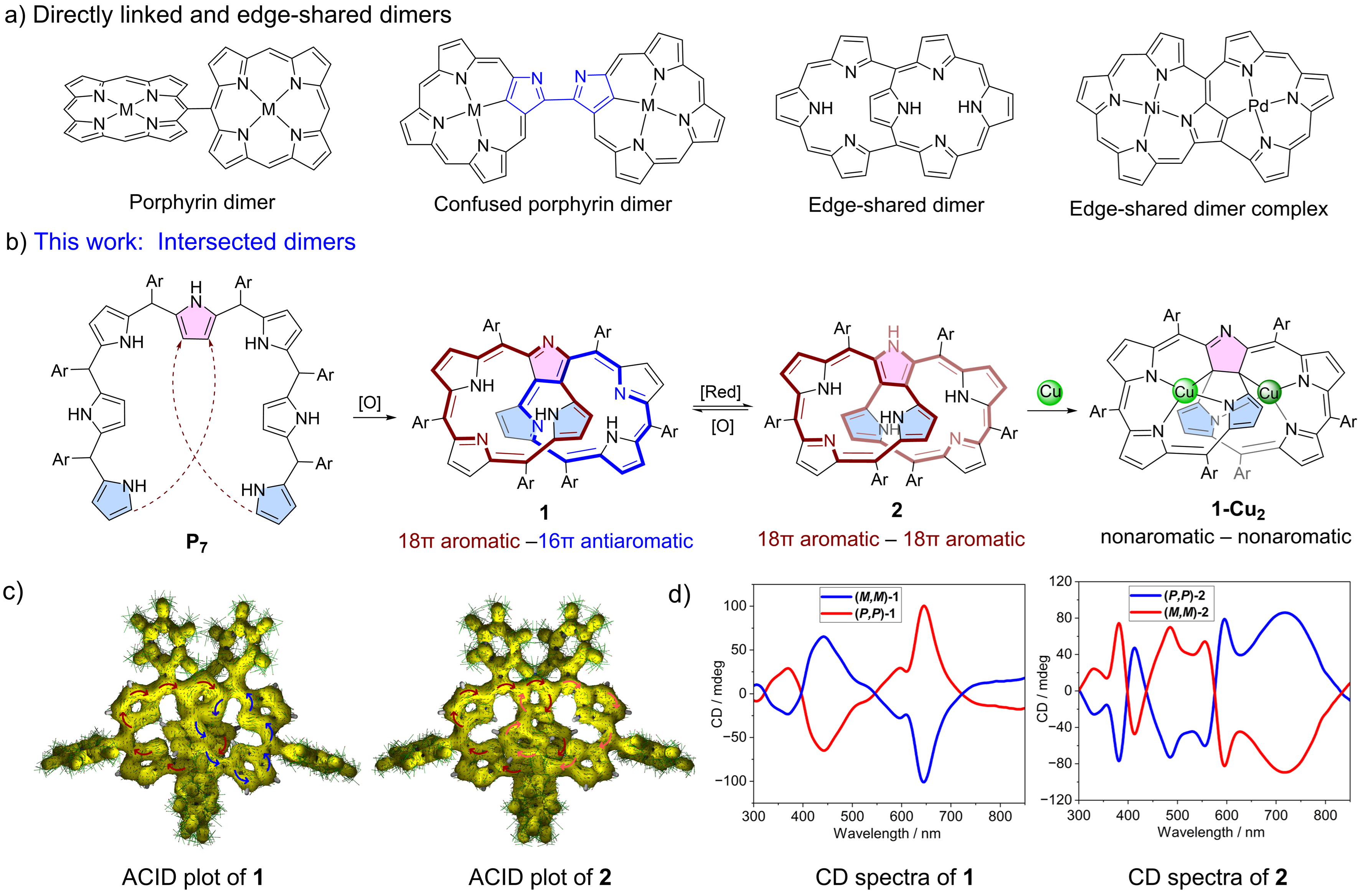 本研究在合成长链七吡咯烷柔性前体P7基础上,将其在 DDQ/CH2Cl2加热回流,可得到交叉连接的双环 N-错位咔咯二聚体1和2,其两个末端吡咯环的α-碳原子与中间吡咯环的两个β-碳原子交叉连接,形成了独特的交叉连接拓扑结构 (图b)。实验与理论计算研究结果表明,1和2分别表现出 (18π)芳香性-(16π)反芳香性和 (18π)芳香性-(18π)芳香性 (图c),两者可通过氧化还原反应相互转化。值得一提的是,2的芳香性能够通过溶剂极性来调控,极性增大,其芳香性增强。此外,1和2均可以螯合铜离子形成具有(18π)芳香性非芳香性特征的单Cu(III)配合物和非芳香性非芳香性的双铜配合物 1-Cu2。研究表明,双铜配合物 1-Cu2存在Cu(II)-Cu(III)配合物与Cu(II)-Cu(II)-自由基的动态平衡。本文所构筑的二聚体及其配合物具有独特的交错连接的永久手性拓扑结构,因而其均可拆分为一对手性对映体 (图d)。其中,对映体2具有最大不对称吸收因子,|gabs| 最高可达 0.015 (718 nm)。本文通过长链多吡咯烷的氧化环化反应,成功构建了一类具有独特交叉连接拓扑结构和芳香性可控的新型双环异卟啉二聚体,为开发金属自由基多自旋系统和持久手性分子提供了一类具有应用前景的研究平台,有望推动近红外光手性材料、分子基磁体和自旋电子器件等领域的发展。