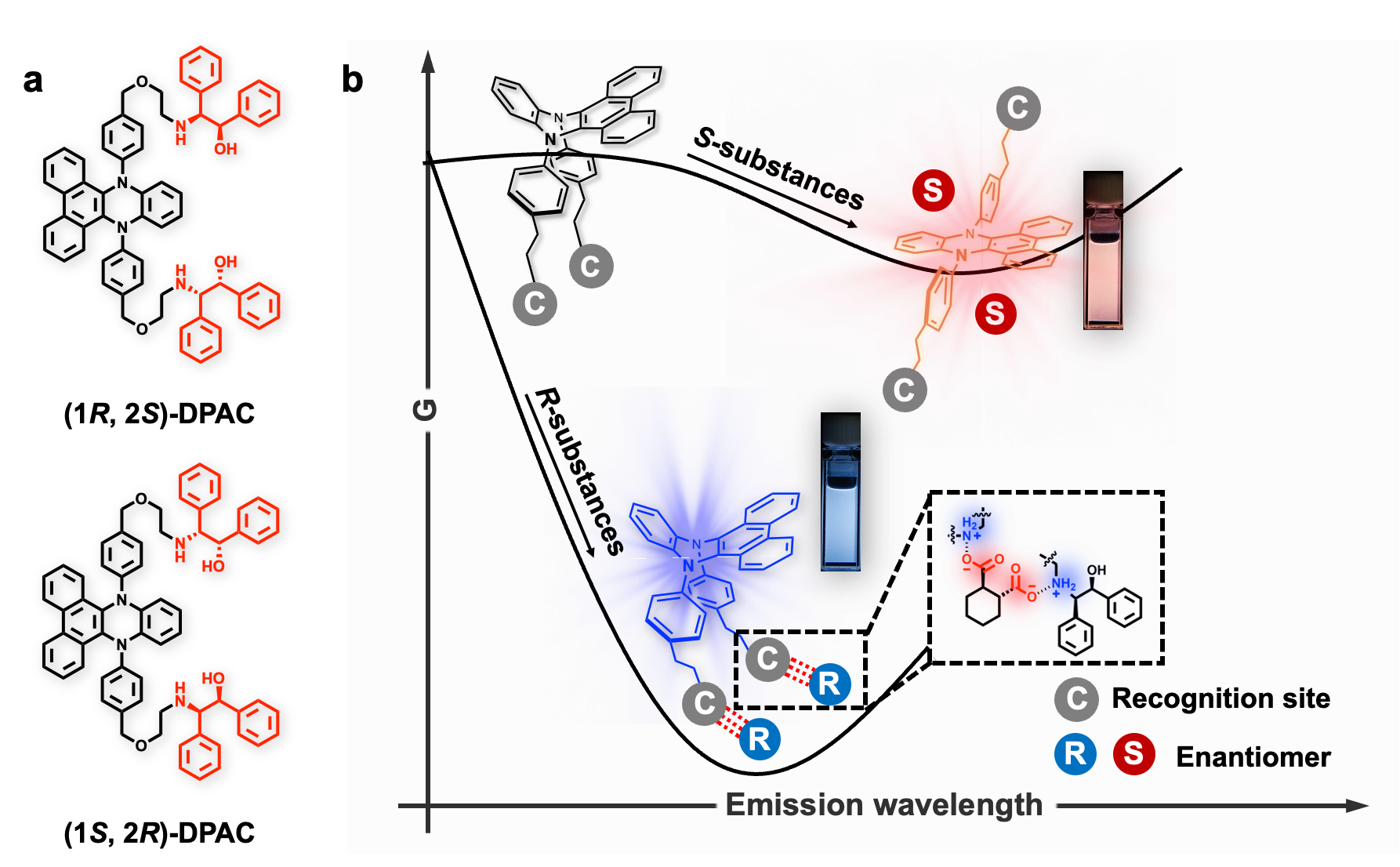 手性是自然界赋予分子的“镜像”属性,也是药物、农药、食品添加剂能否发挥预期作用、避免毒副作用的重要因素之一,因此精确识别对映体并开发相应分析技术尤为重要。基于发光的检测技术具有简便、快速以及实时监测等优点,其核心挑战在于利用染料与对映异构体之间的差异性相互作用,精确调节其发射能级,实现对映体的高灵敏度区分。近日,365英国上市集团官网化学与分子工程学院田禾院士、马骧教授团队在功能染料手性识别领域取得重要进展,相关研究成果发表于《自然·通讯》(Nature Commun. 2025, 16, 7788)。